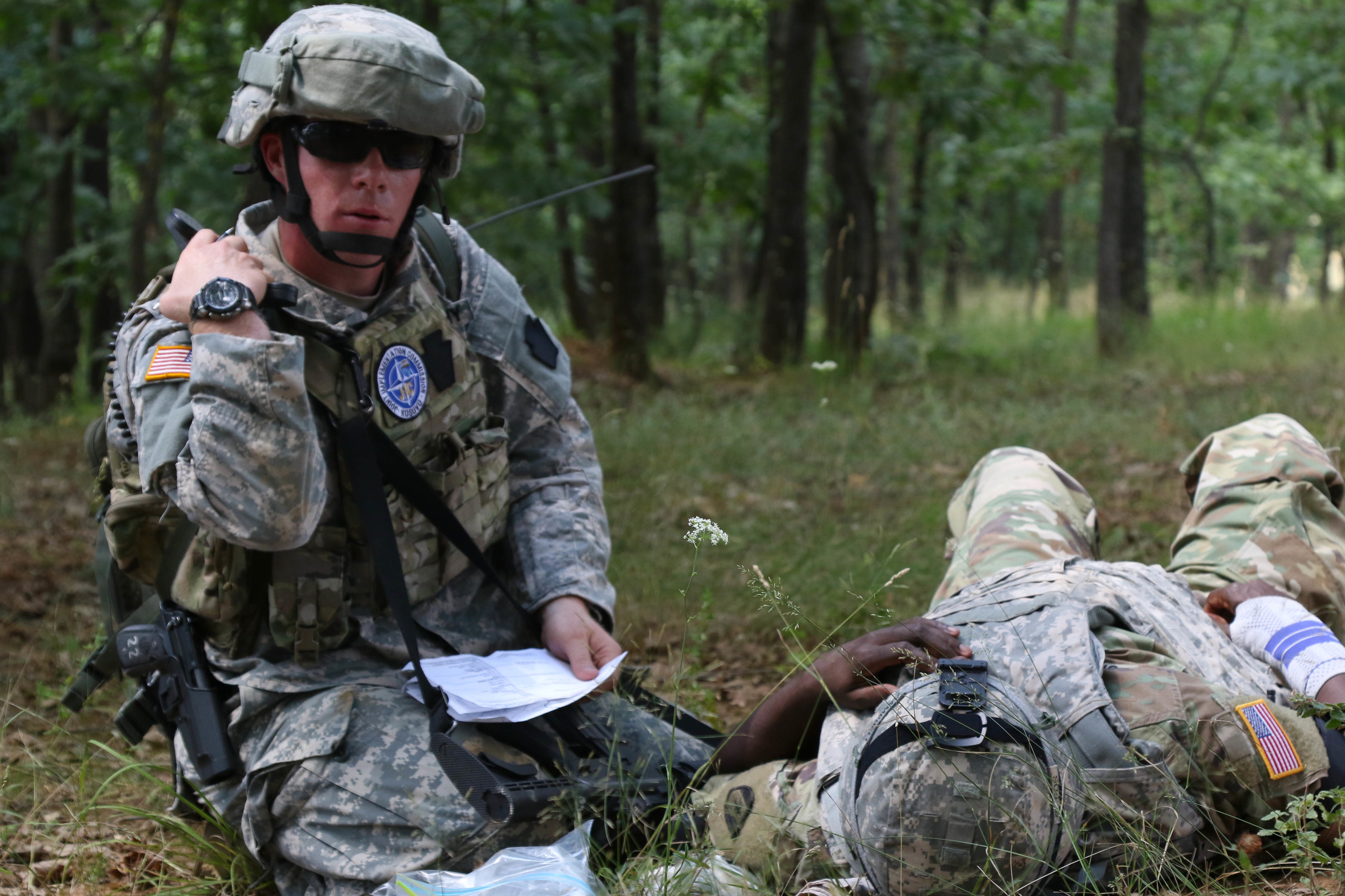 Sgt. Andrew Couchenour, an Intelligence NCO assigned to Headquarters and Headquarters Company, 2nd Infantry Brigade Combat Team, 28th Infantry Division, calls in a nine-line medevac during day one of the Multinational Battle Group-East's Best Warrior Competition on Camp Bondsteel, Kosovo, July 9. (U.S. Army photo by: Staff Sgt. Thomas Duval, Multinational Battle Group-East Public Affairs