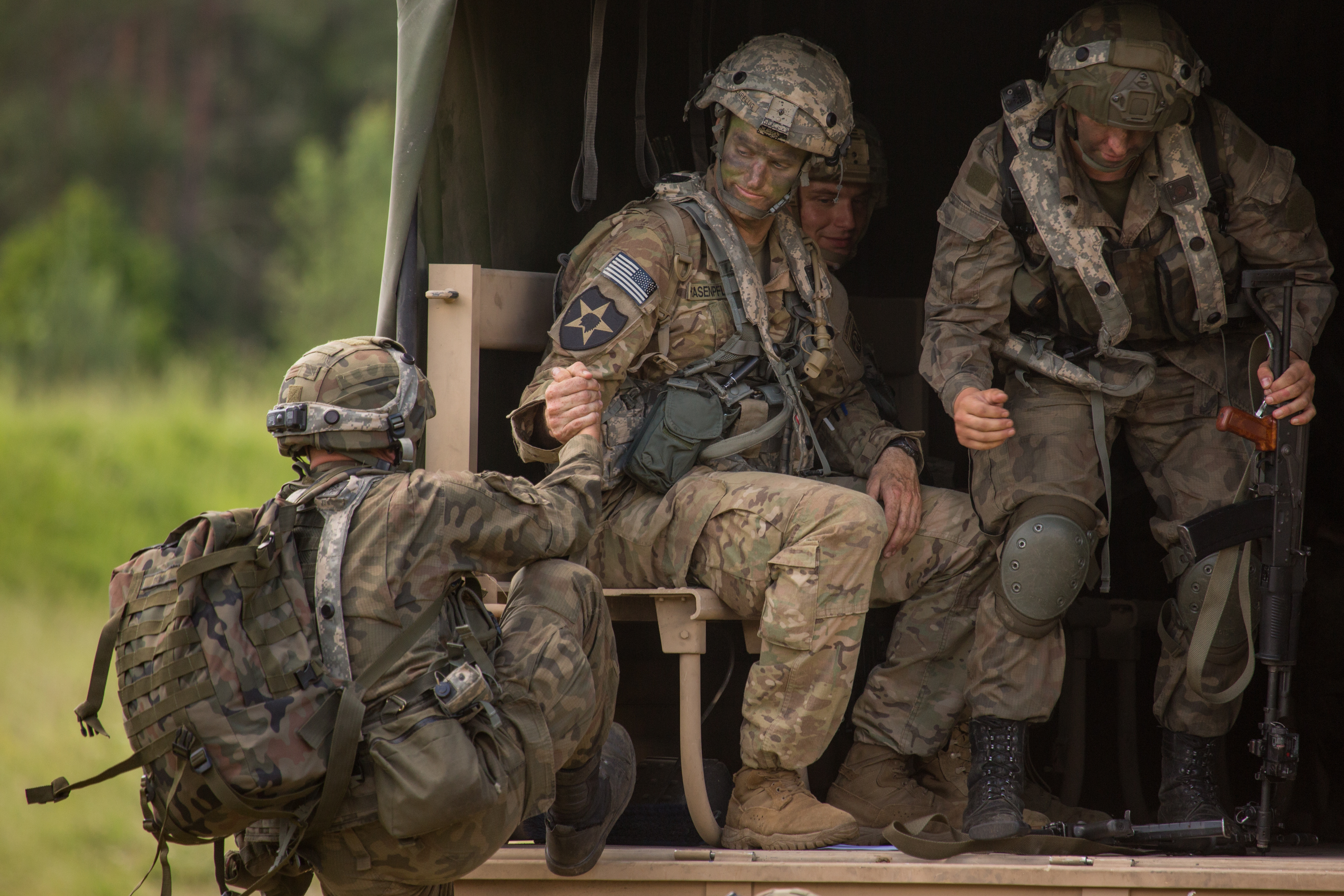 U.S. Soldiers of Headquarters and Headquarters Company, 1st Battalion, 504th Parachute Infantry Regiment prepare for movement during Swift Response 16 training exercise at the Hohenfels Training Area, a part of the Joint Multinational Readiness Center, in Hohenfels, Germany, Jun. 22, 2016. Exercise Swift Response is one of the premier military crisis response training events for multi-national airborne forces in the world. Swift Response 16 includes more than 5,000 Soldiers and Airmen from Belgium, France, Germany, Great Britain, Italy, the Netherlands, Poland, Portugal, Spain and the United States and takes place in Poland and Germany, May 27-June 26, 2016. (U.S. Army photo by Spc. Bryan Rankin/Released)