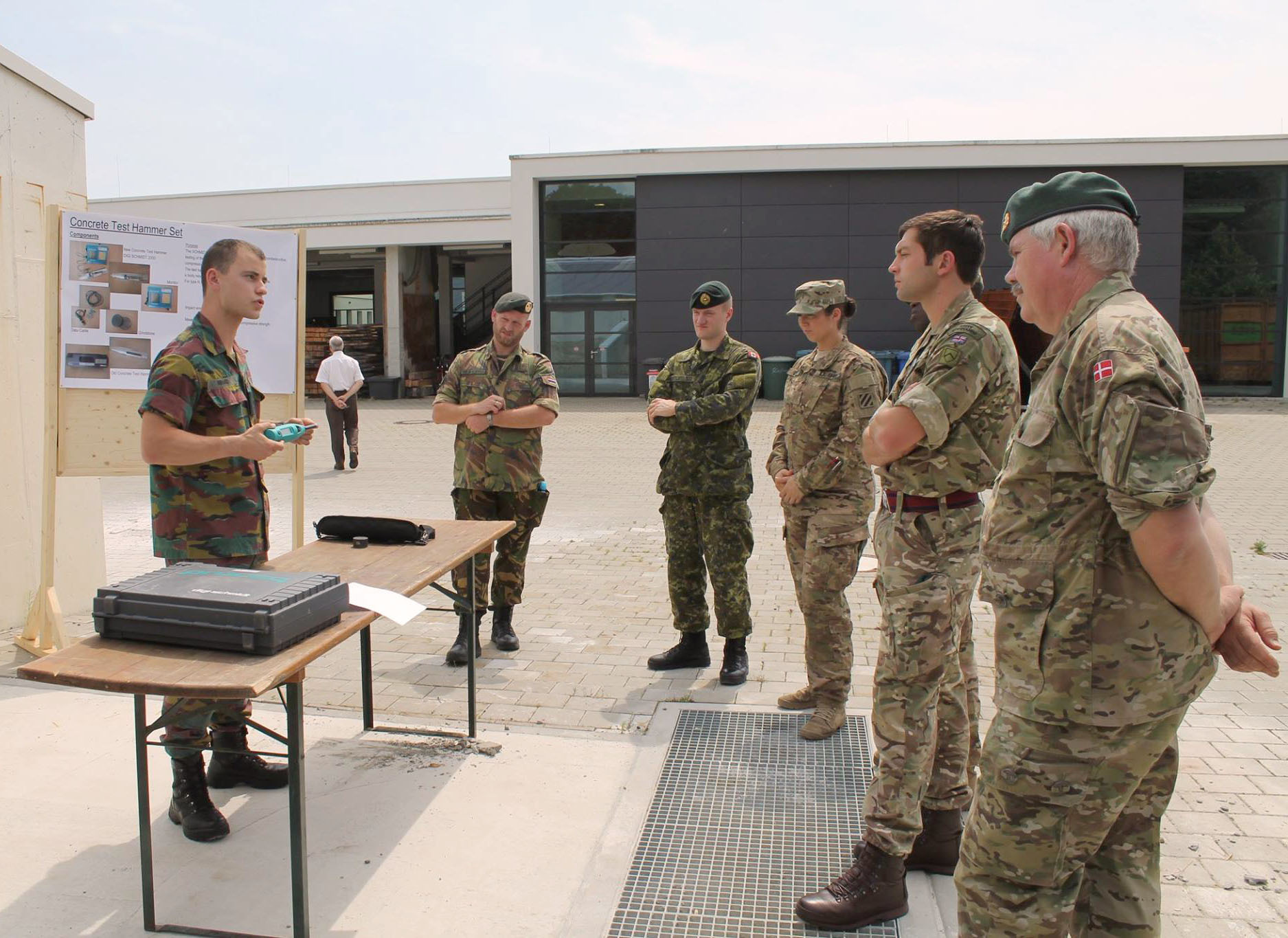 U.S. Army 2nd Lt. Katelynn Clark (center), an assistant operations officer for the 10th Engineer Battalion, 1st Armored Brigade Combat Team, 3rd Infantry Division, listens as a Belgian officer talks about different equipment they use to assess bridges during a an International Bridge Assessment Course at Ingolstadt, Germany July 12. The course, a bilateral project from the Belgian and German engineer schools, supported by the Military Engineering Centre of Excellence, aims to inform Soldiers on the different existing bridge assessment methods.