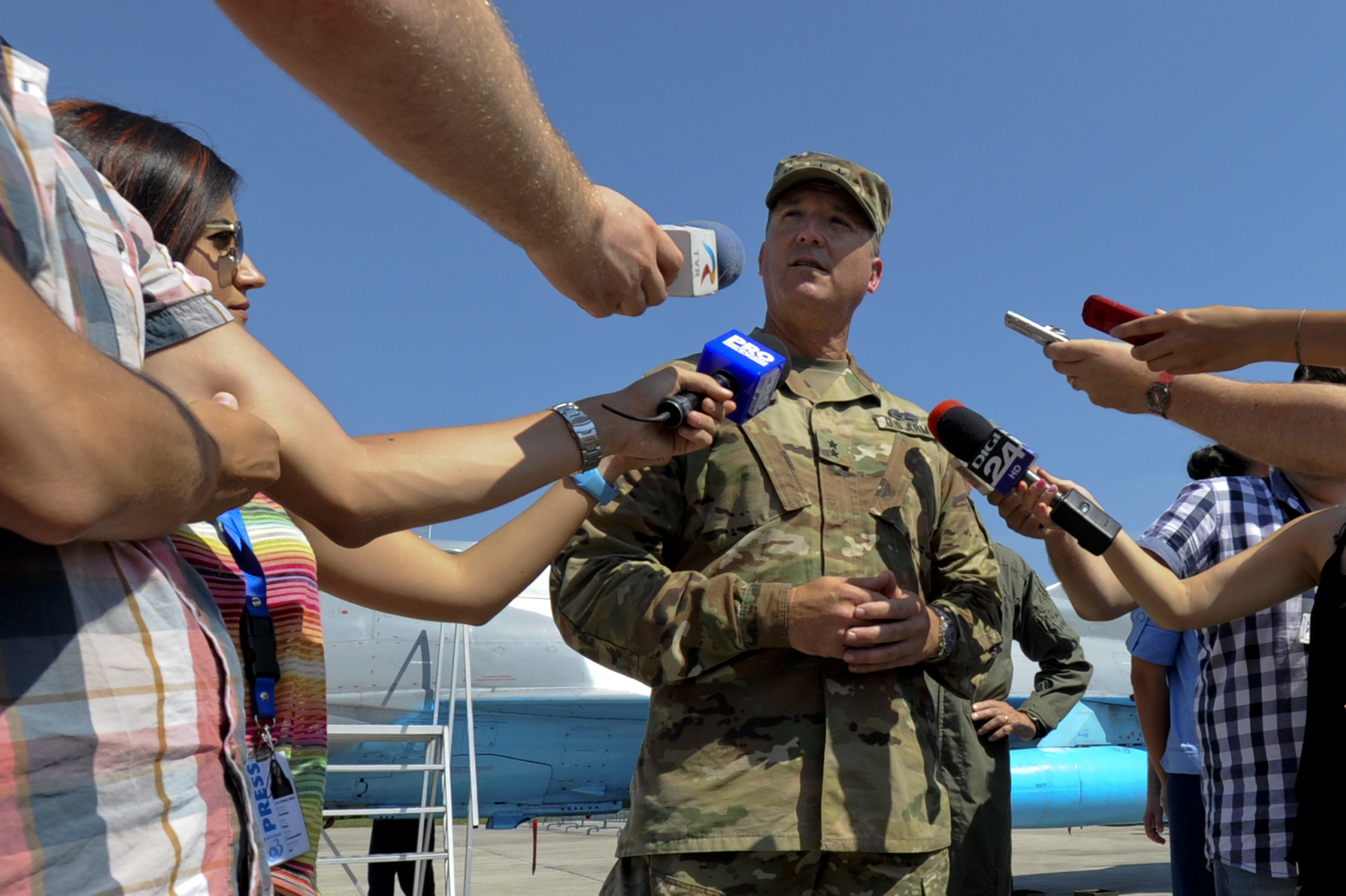 California Army National Guard Maj. Gen. Matthew Beevers answers reporters' questions during the Romanian air force's 71st Air Base's air show and open house at Campia Turzii, Romania, July 23, 2016.