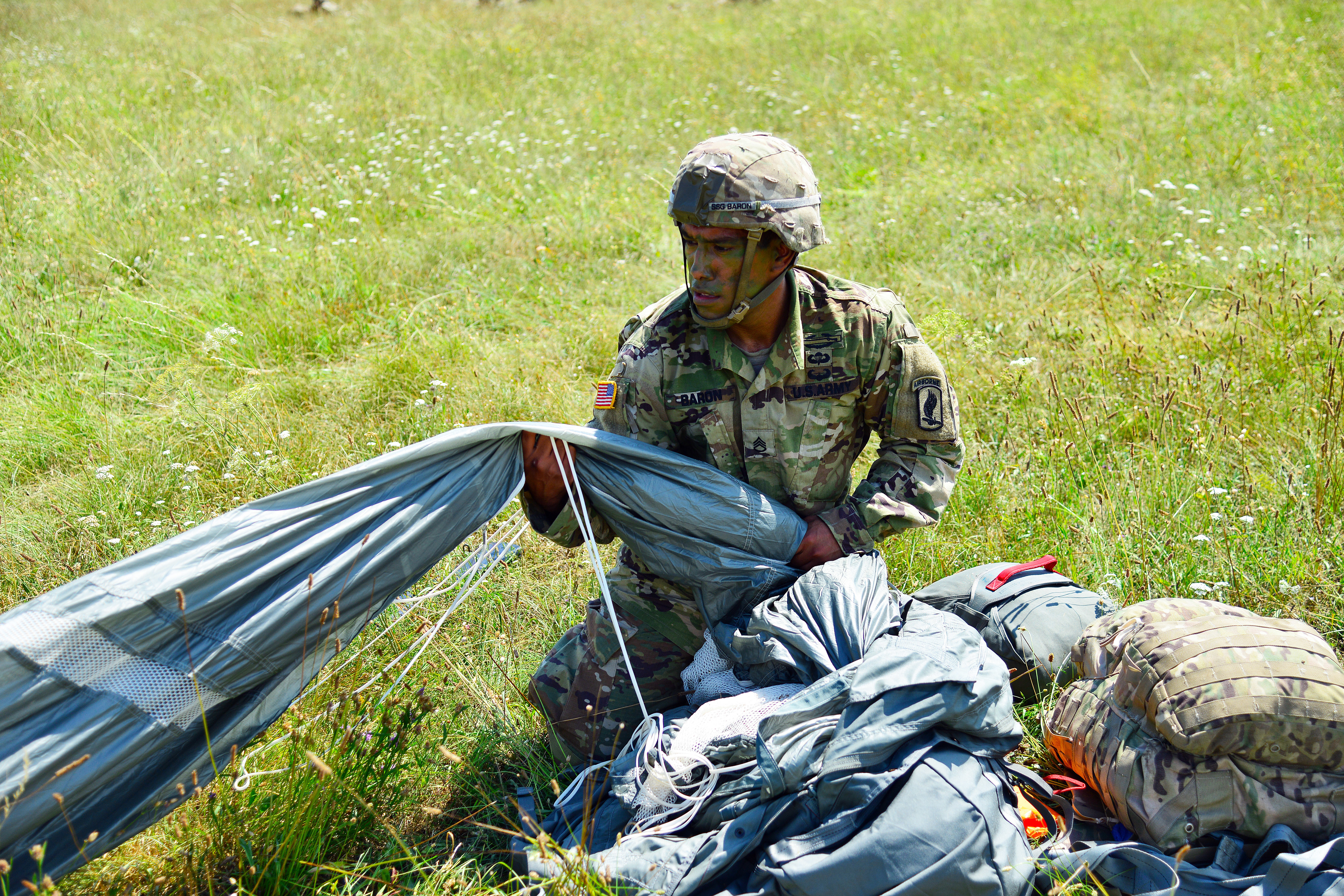 U.S. Army paratrooper Staff Sgt. Zach Baron, assigned to 2nd Battalion, 503rd Infantry Regiment, 173rd Airborne Brigade, recovers his equipment after conducting airborne operations at Juliet Drop Zone in Pordenone, Italy, July 26, 2016. The 173rd Airborne Brigade is the U.S. Army Contingency Response Force in Europe, capable of projecting ready forces anywhere in the U.S. European, Africa or Central Commands' areas of responsibility within 18 hours. (U.S. Army Photo by Visual Information Specialist Davide Dalla Massara)