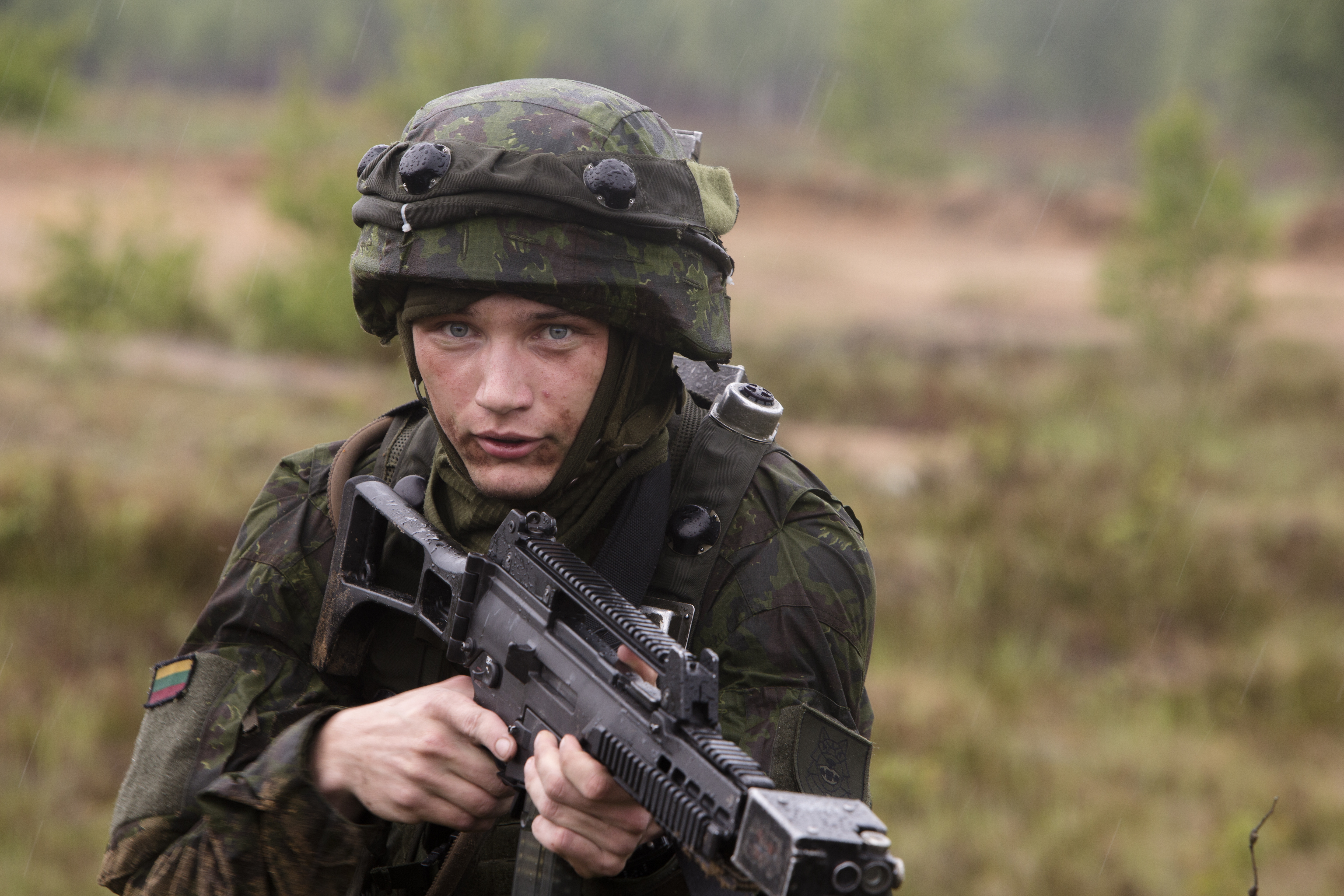 A Lithuanian soldier looks up as she prepares to move positions during Exercise Saber Strike 16 aboard Adazi Military Base, Latvia, June 17, 2016. U.S. and NATO Allies participate in this theater security cooperation exercise to prepare participants for worldwide contingency operations. (U.S. Marine Corps photo by Cpl. Kelly L. Street, 2D MARDIV COMCAM/Released)