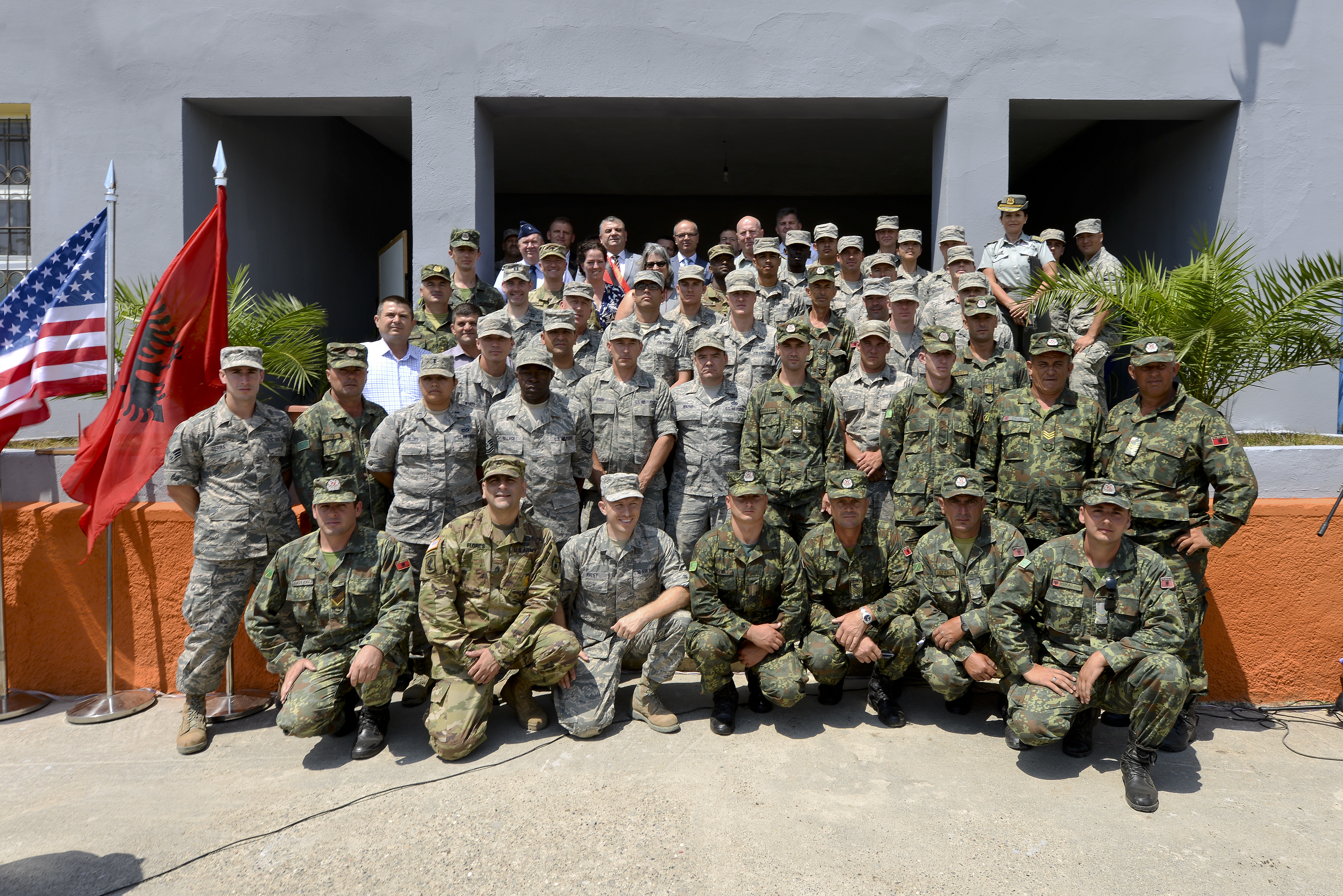 Distinguished visitors, U.S. Air Force, Army and Navy and Albanian Army land forces military leaders pose for a group photo after an inauguration ceremony marking the completion of renovation of the 12 year school in Mjede, Albania on July 15, 2016. The partial renovation of the school was made possible by the European Commands’ Humanitarian Civic Assistance (HCA) program of the United States Department of Defense. (U.S. Air National Guard photo by Master Sgt. Andrew J. Moseley/Released)