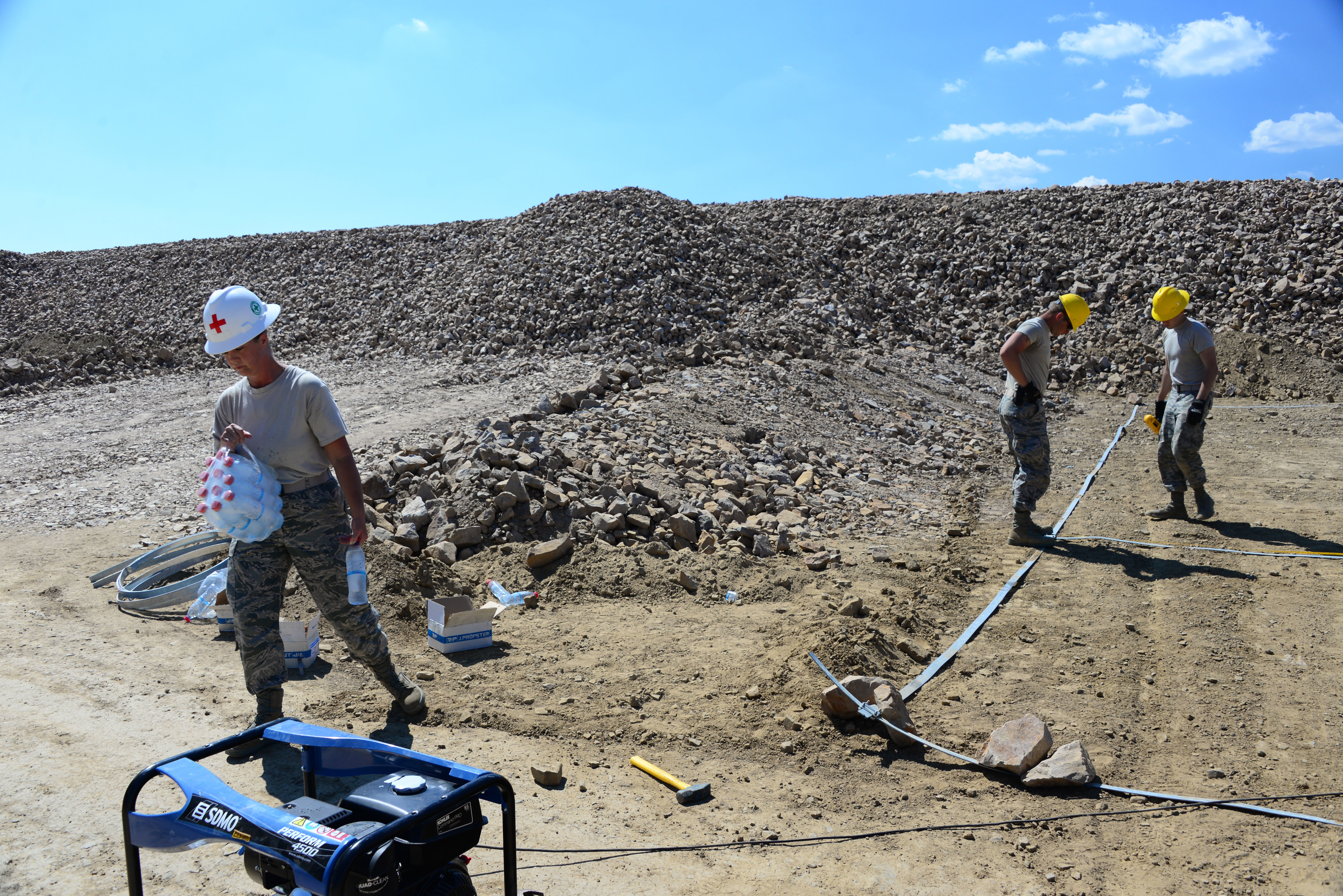 Airmen from the 118th Mission Support Group, Tennessee Air National Guard, construct lightening protection grid work for the Ammo Holding Area, better known as the AHA, Aug. 16, 2016, at Novo Selo Training Area, Bulgaria. Tennessee National Guard Soldiers and Airmen were on rotations to complete thier portions of projects as part of Operation Resolute Castle 16, an ongoing operation of military construction to build up Eastern European base infrastructure and help strengthen ties between Tennessee's state partnership with Bulgaria. (U.S. Air National Guard photo by Master Sgt. Kendra M. Owenby, 134 ARW Public Affairs)