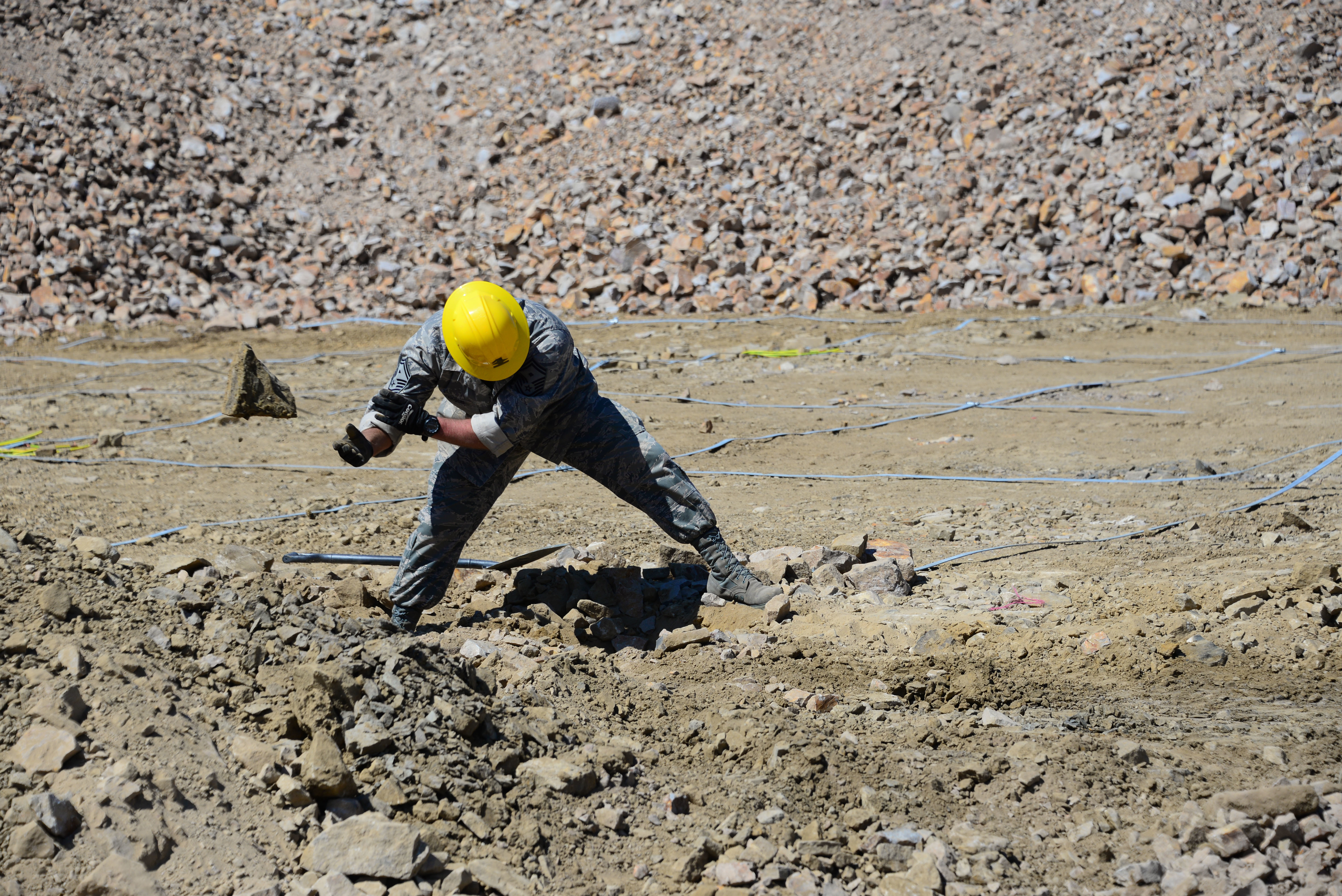 1st Sgt. Michael Parson, 118th Mission Support Group, Tennessee Air National Guard, clears rocks for a foundation for the Ammo Holding Area, better known as the AHA, Aug. 16, 2016, at Novo Selo Training Area, Bulgaria. Tennessee National Guard Soldiers and Airmen were on rotations to complete thier portions of projects as part of Operation Resolute Castle 16, an ongoing operation of military construction to build up Eastern European base infrastructure and help strengthen ties between Tennessee's state partnership with Bulgaria. (U.S. Air National Guard photo by Master Sgt. Kendra M. Owenby, 134 ARW Public Affairs)