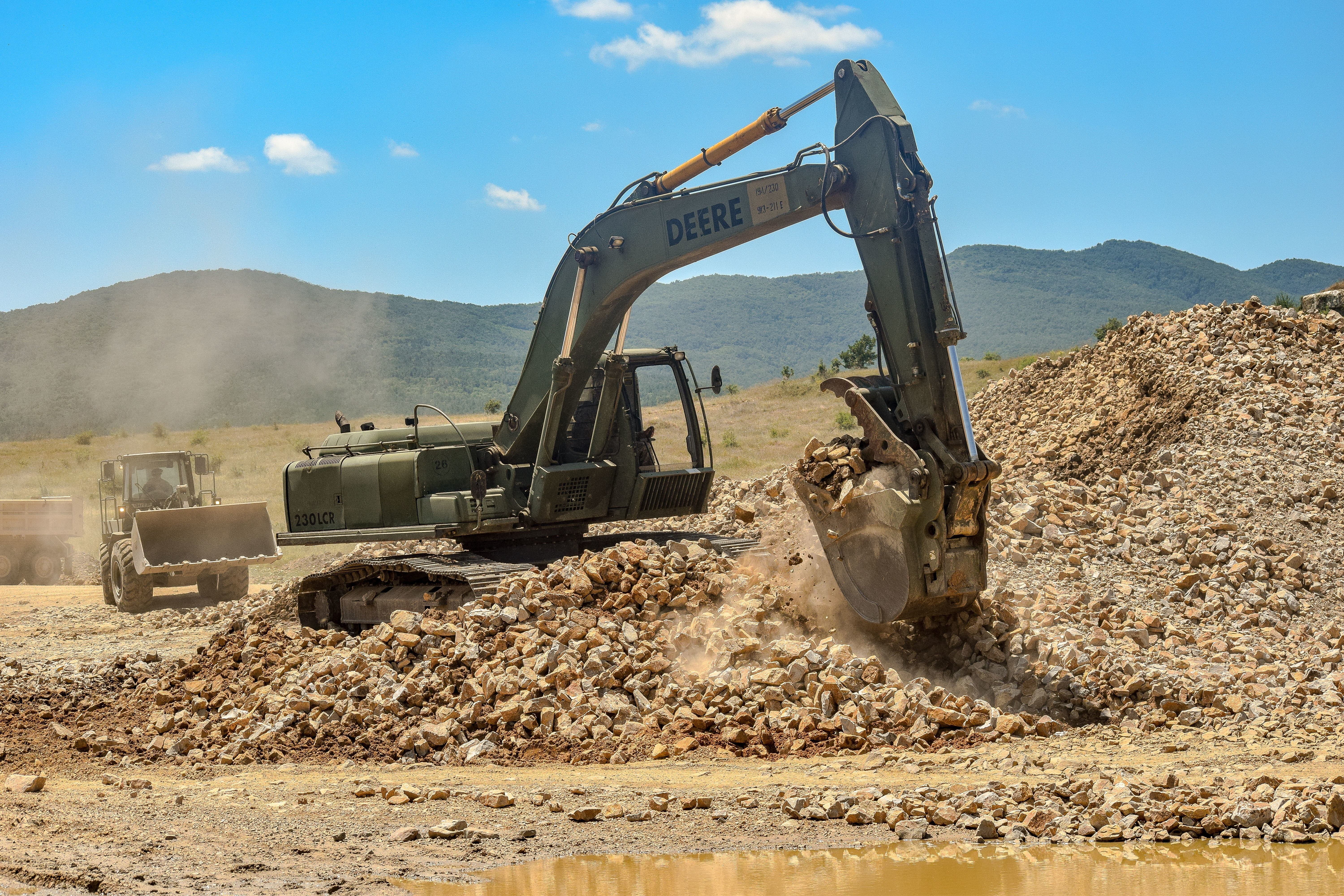 A hydraulic excavator operated by military engineers from the 841st Engineer Battalion, U.S. Army Reserve moves rock near a road under construction on July 6, 2016 at Novo Selo Training Area, Bulgaria during Operation Resolute Castle 2016. Soldiers from the 841st Engineer Battalion spent the summer of 2016 working with service members from the Tennessee Army National Guard and Mississippi Army National Guard to improve a tank training range and ammunition holding area in Bulgaria. (U.S. Army photo by Capt. Kimberlee Lewis, 841st Engineer Battalion, U.S. Army Reserve)