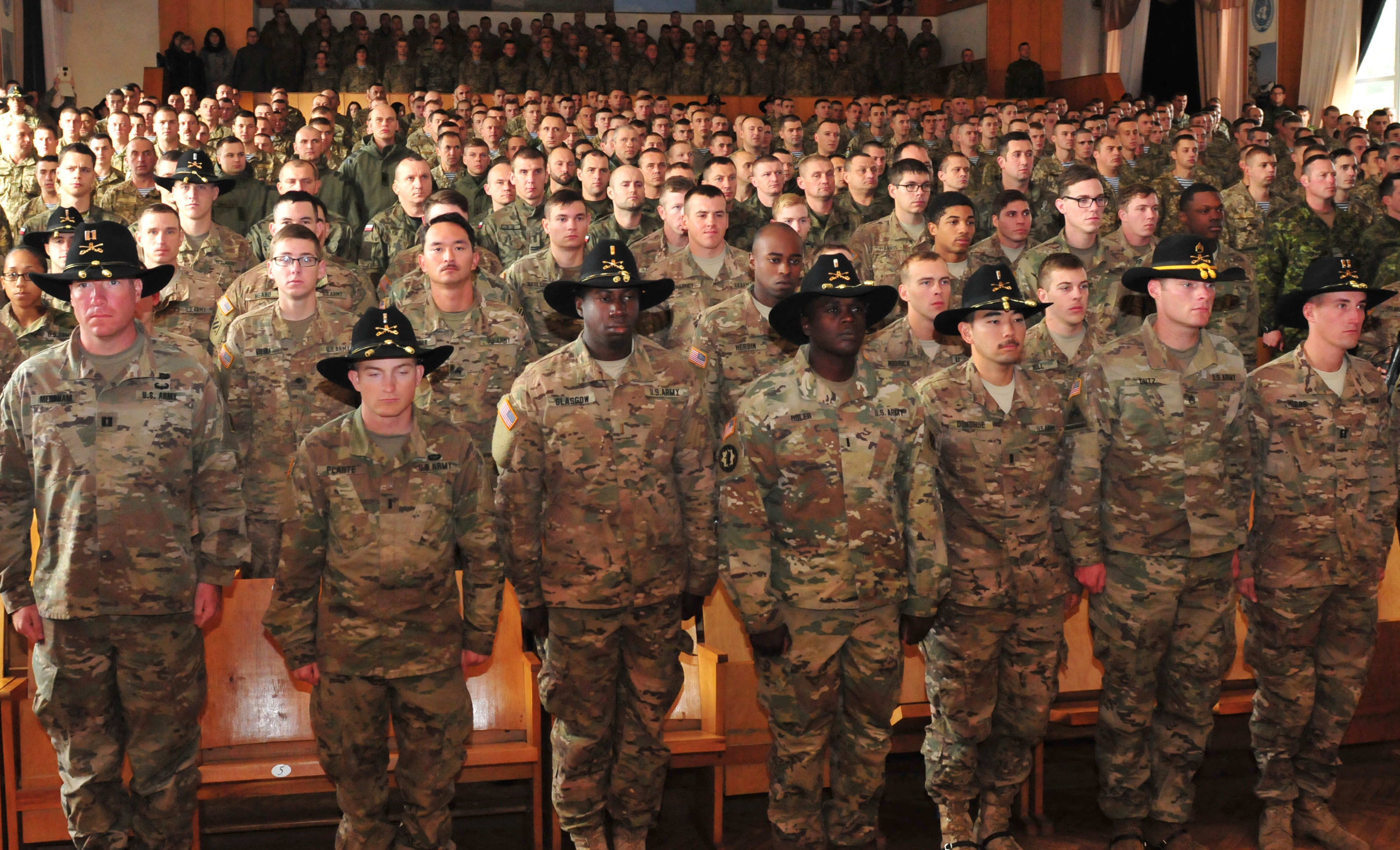Soldiers from U.S., Ukraine, Canada, Poland and Lithuania stand for the National Anthems during an opening ceremony for the fifth training rotation here, Oct. 8. The ceremony officially marks the start of Ukraine's 1st Battalion, 80th Airmobile Brigade's 55-day training rotation as part of the Joint Multinational Training Group-Ukraine. The mission of JMTG-U is to reinforce defensive skills of the Ukrainian Ground Forces in order to increase their capacity for self-defense. (Photo by Army Staff Sgt. Elizabeth Tarr)