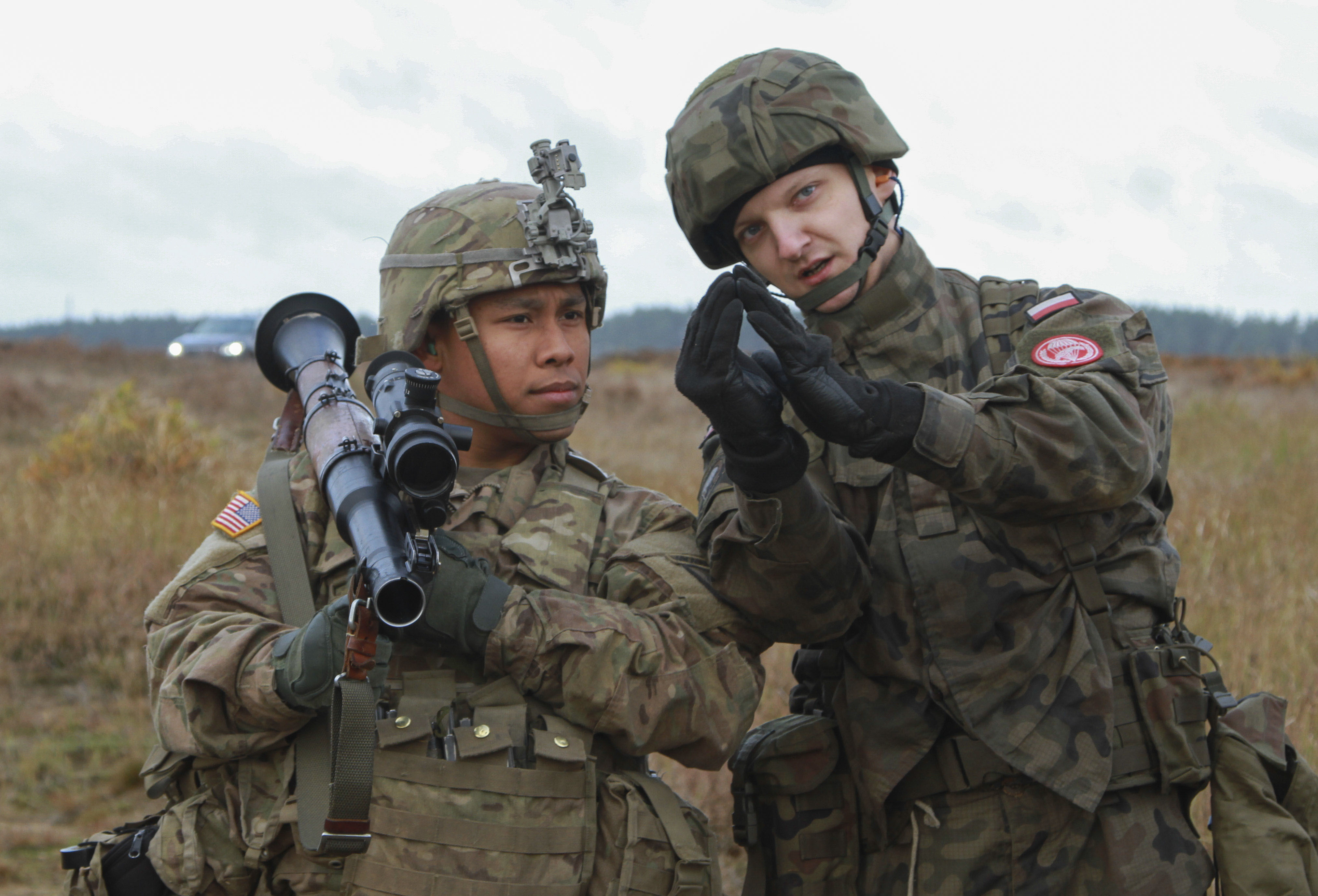 DRAWSKO POMORSKIE, Poland – Spc. Jacob Quitugua, Paratrooper, Company D, 2nd Battalion, 503rd Infantry Regiment, 173rd Airborne Brigade, holds an RPG-7D Anti-Tank Grenade Launcher while Polish Pvt. Paweł Tylek, paratrooper, 16th Polish Airborne Battalion, 6th Airborne Brigade, describes the proper sight picture of the weapon during anti-tank training in Studnica, Poland, Oct. 29, 2016. The training provided both U.S. and Polish forces cross training on the M136 AT4 anti-tank weapon and the RPG-7D Anti-Tank Grenade Launcher. The “Sky Soldiers” of D Co., 2nd Bn., 503rd Inf. Regt., are on a training rotation in support of Operation Atlantic Resolve, a U.S. led effort in Eastern Europe that demonstrates U.S. commitment to the collective security of NATO and dedication to enduring peace and stability in the region. (U.S. Army photo by Sgt. Lauren Harrah/Released)