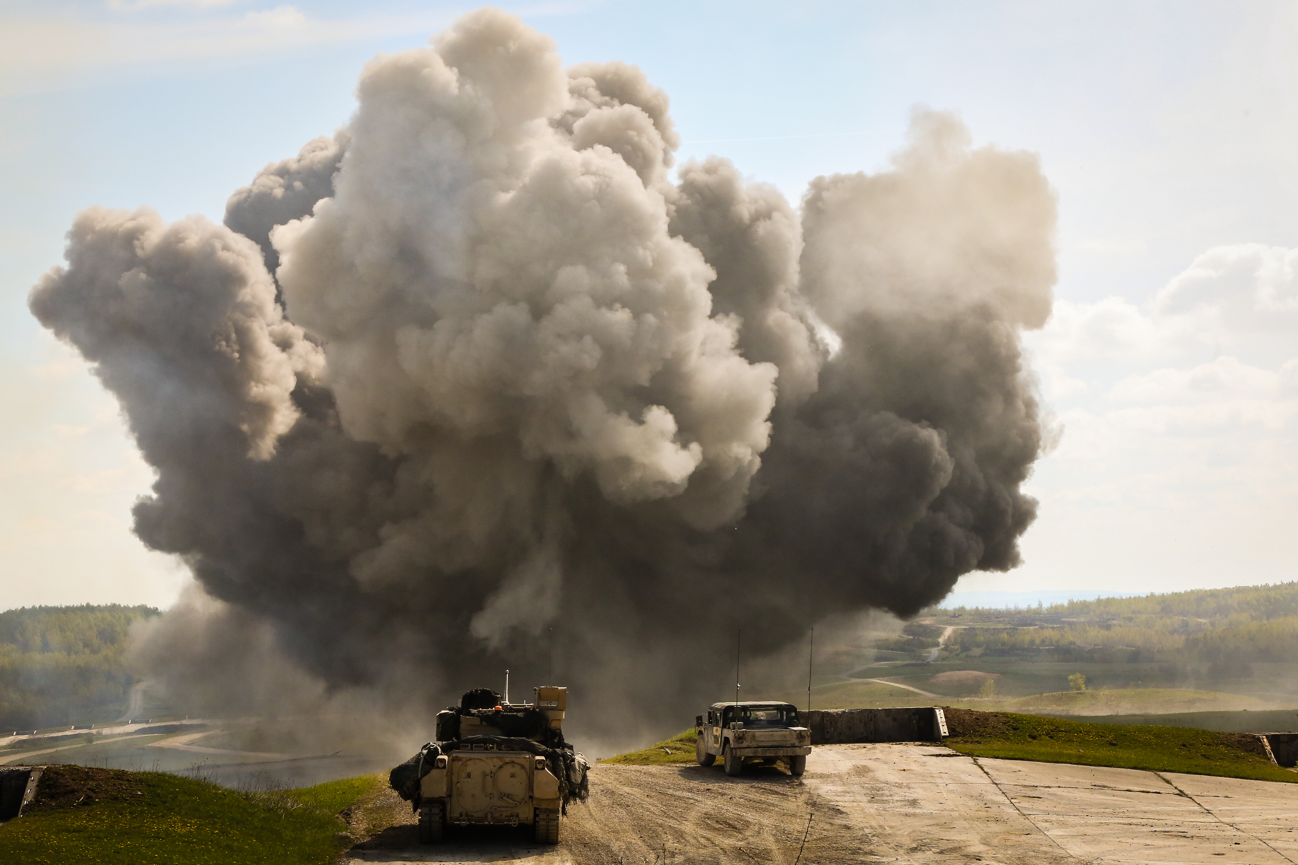 U.S. Soldiers of 1st Battalion, 66th Armored Regiment, 3rd Armored Brigade Combat Team, 4th Infantry Division use a Line Demolition Charge System while coordinating an obstacle reduction mission during Exercise Combined Resolve VIII at the Grafenwoehr Training Area, Grafenwoehr, Germany April 24, 2017. Exercise Combined Resolve VIII is a multinational exercise designed to train the Army’s Regionally Allocated Forces to the U.S. European Command. Combined Resolve VIII will include more than 3,400 participants from 10 nations. The goal of the exercise is to prepare forces in Europe to operate together to promote stability and security in the region. (U.S. Army photo by Spc. Randy Wren)
