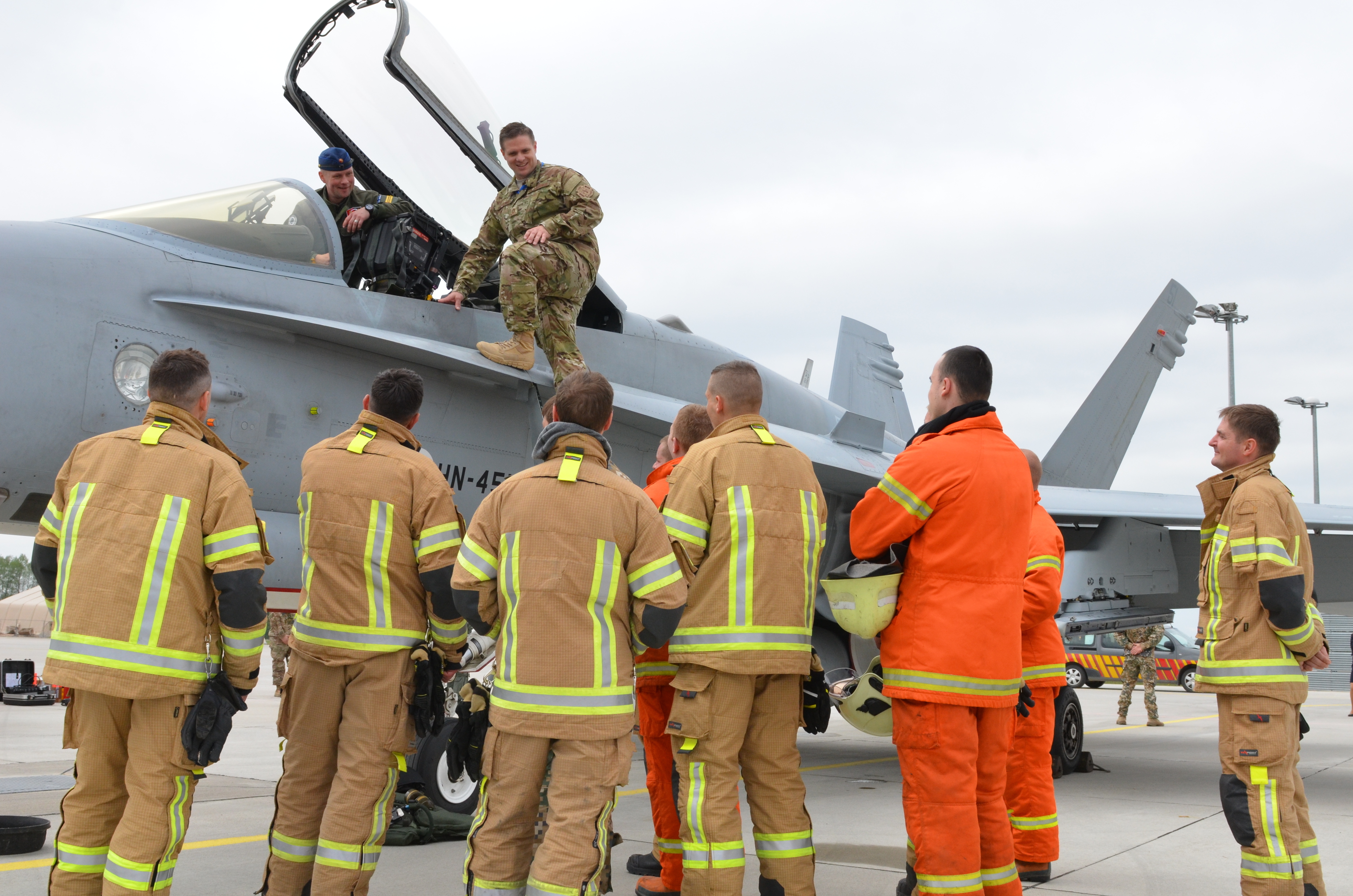 U.S. Air Force Senior Master Sgt. Jeremy Wohlfore, Air National Guardsman with the Alpena Combat Readiness Training Center, Michigan, provides a quick emergency egress class on the F/A-18 Hornet jet to Latvian firefighters while the jet is being refueled on the airfield, May 18. Wohlfore has routinely made trips to Leilvarde since 2008 to provide training to members of the Latvian air force to enhance their capabilities. Latvia is Michigan's State Partnership Program partner, a program designed to promote interoperability and stability in Baltic nations since 1993. (U.S. Army photo by Sgt. Shiloh Capers)