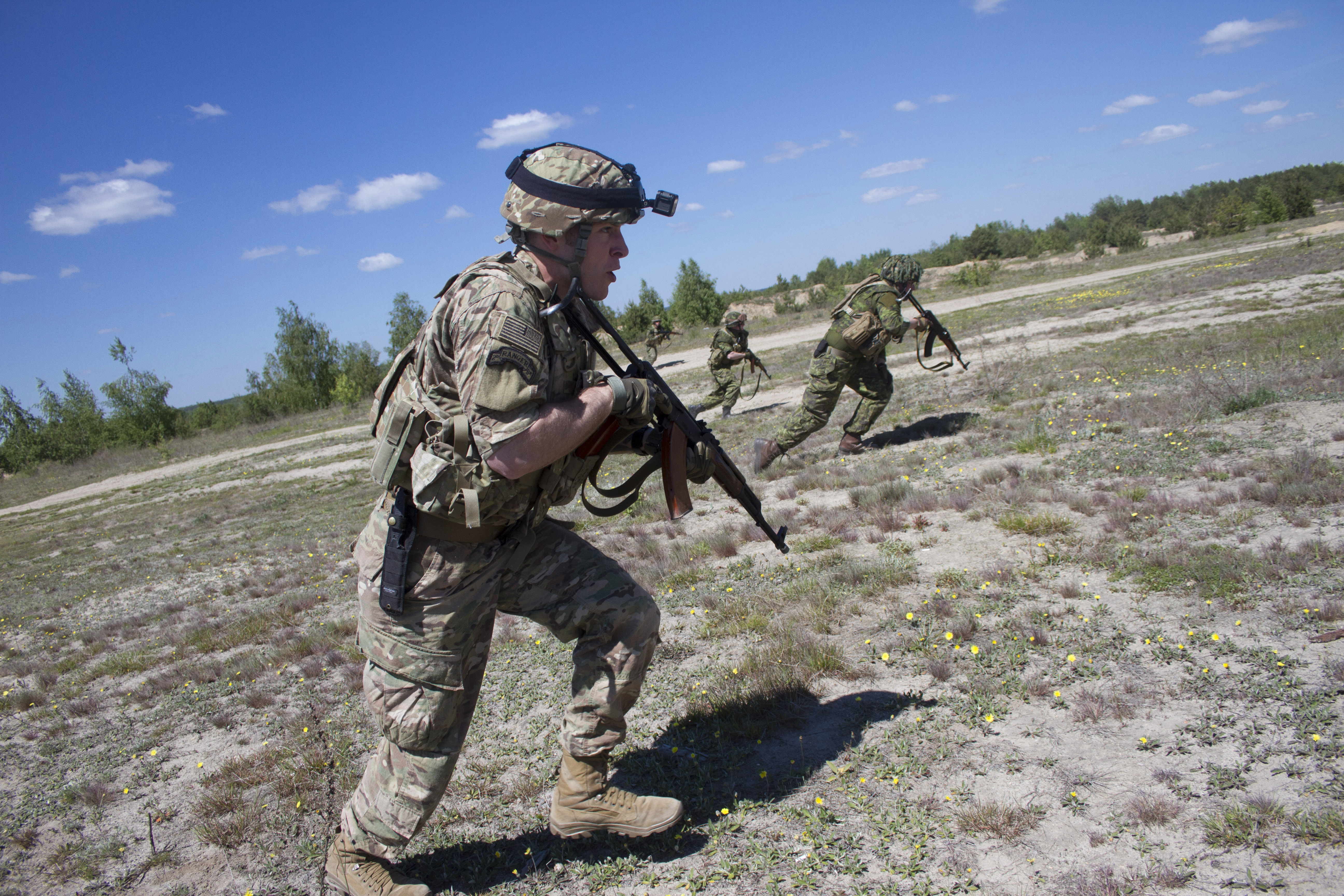Sgt. Matthew Councill, a member of the 45th Infantry Brigade Combat Team assigned to the Joint Multinational Training Group - Ukraine, bounds forward with a team of Canadian soldiers while acting as the second in charge of a combined Canadian - U.S. Army section during a section attack demonstration for Ukrainian noncommissioned officers at a Ukrainian army base near Zhytomyr, Ukraine, on May 22. U.S. Soldiers from the 45th Infantry Brigade Combat Team assigned to the Joint Multinational Training Group - Ukraine are working alongside Canadian troops to train Ukrainian noncommissioned officers in Zhytomyr before their battalion arrives at the Yavoriv Combat Training Center for a 55-day training rotation later this year. (Photo by Sgt. Anthony Jones, 45th Infantry Brigade Combat Team)