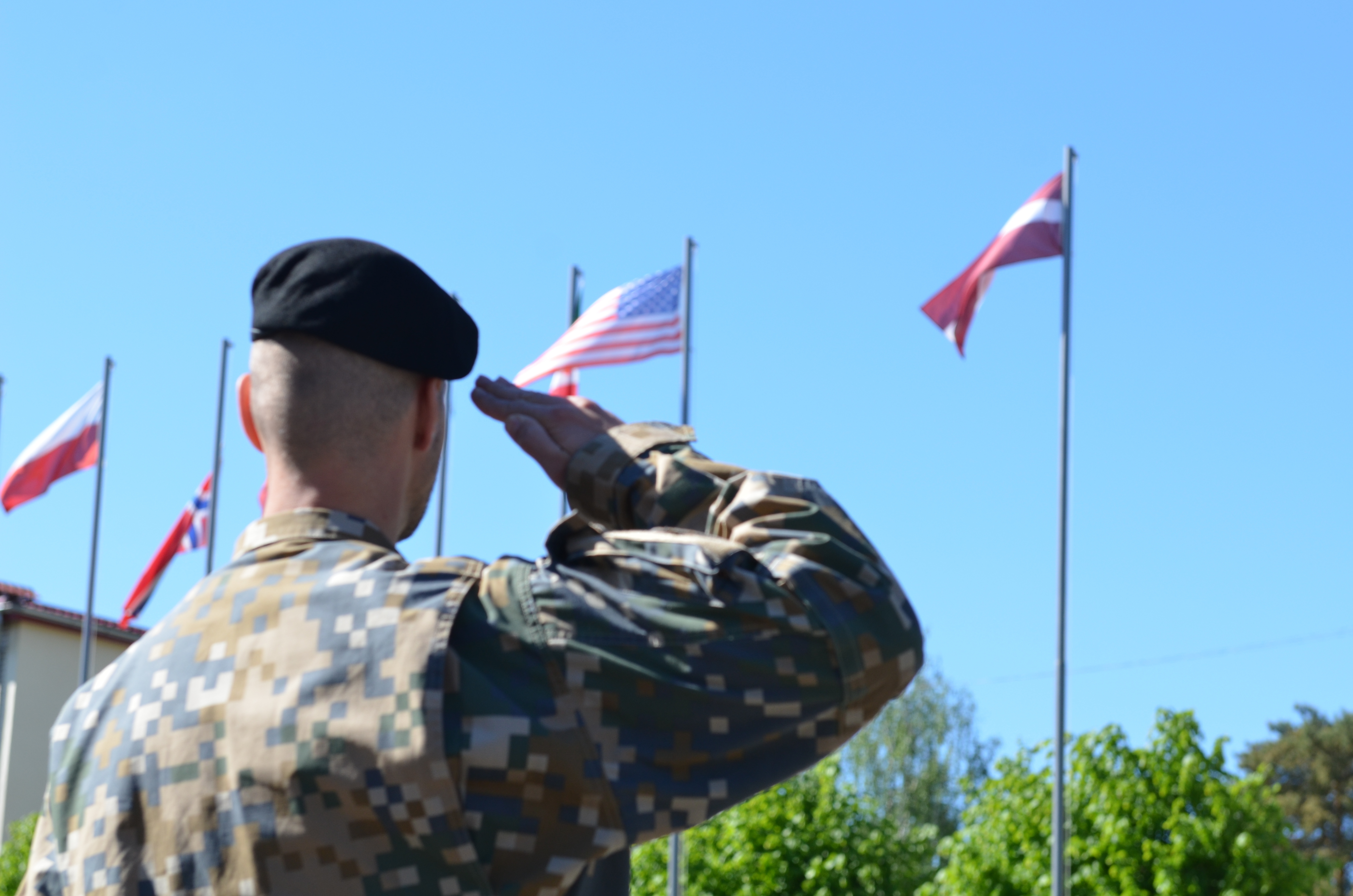 ADAZI, Latvia — Latvian officer 2nd Lt. Viktors Paloks, second platoon commander, 3rd Coy, 2nd Infantry Battalion, Land Forces Infantry Brigade, salutes the nation flag in the opening ceremony of Saber Strike on Adazi Military Base, Latvia, June 3, 2017. Saber Strike is a U.S. Army Europe-led multinational combined forces exercise which occurs annually in the Baltic region. This is the seventh year Saber Strike is in effect and 20 nations are participating in the event, across the borders of Estonia, Latvia, Lithuania and Poland.The countries in the exercise are Belgium, Canada, Croatia, Denmark, Estonia, Finland, France, Germany, Italy, Latvia, Lithuania, Luxembourg, Netherlands, Norway, Poland, Portugal, Slovenia, Slovakia, United Kingdom and the United States. (U.S. Army photo by Sgt. Shiloh Capers)