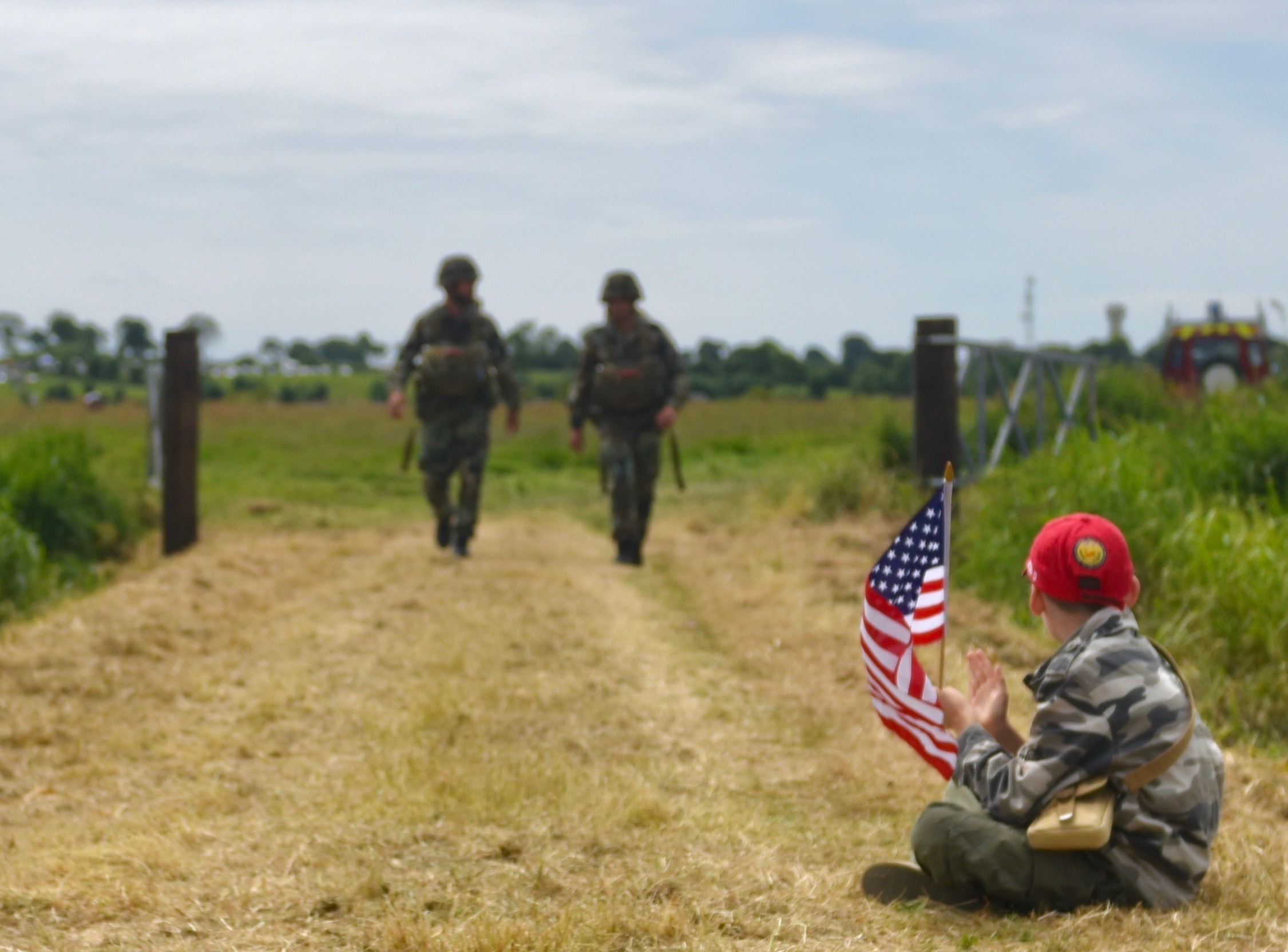 A young French spectators eagerly claps and awaits for two Paratroopers as they come off the drop zone following the commemorative jump by airborne forces into Normandy France for D-Day 73. Paratroopers from across the armed forces and NATO jumped into Normandy to commemorate the 73rd anniversary of Operation Overlord, also known as D-Day.