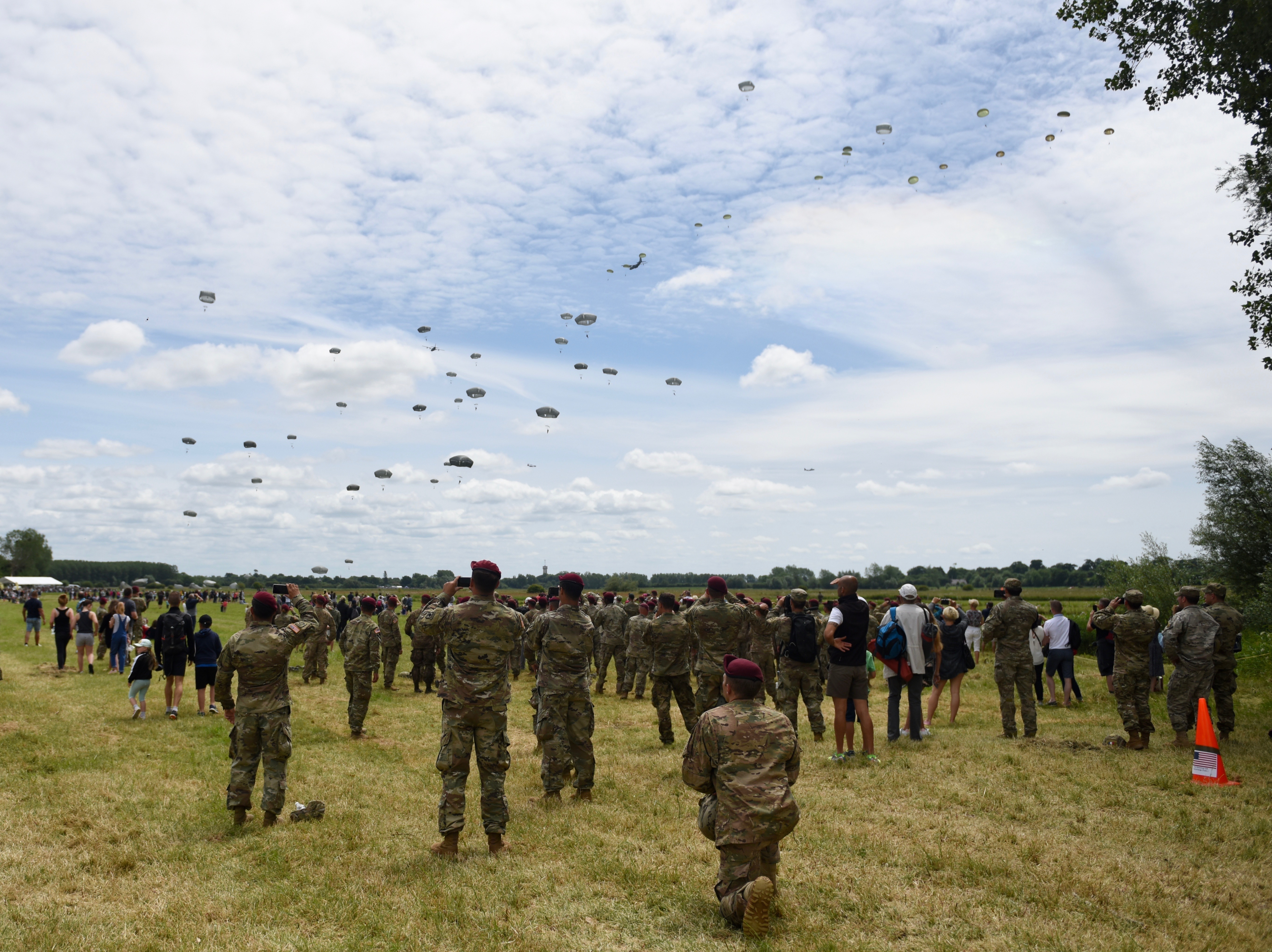 U.S. Army Paratroopers watch the airborne operation on Iron Mike II Drop Zone in Normandy, France on June 4, 2017. Paratroopers from across the armed forces and NATO jumped into Normandy to commemorate the 73rd anniversary of Operation Overlord, also known as D-Day.