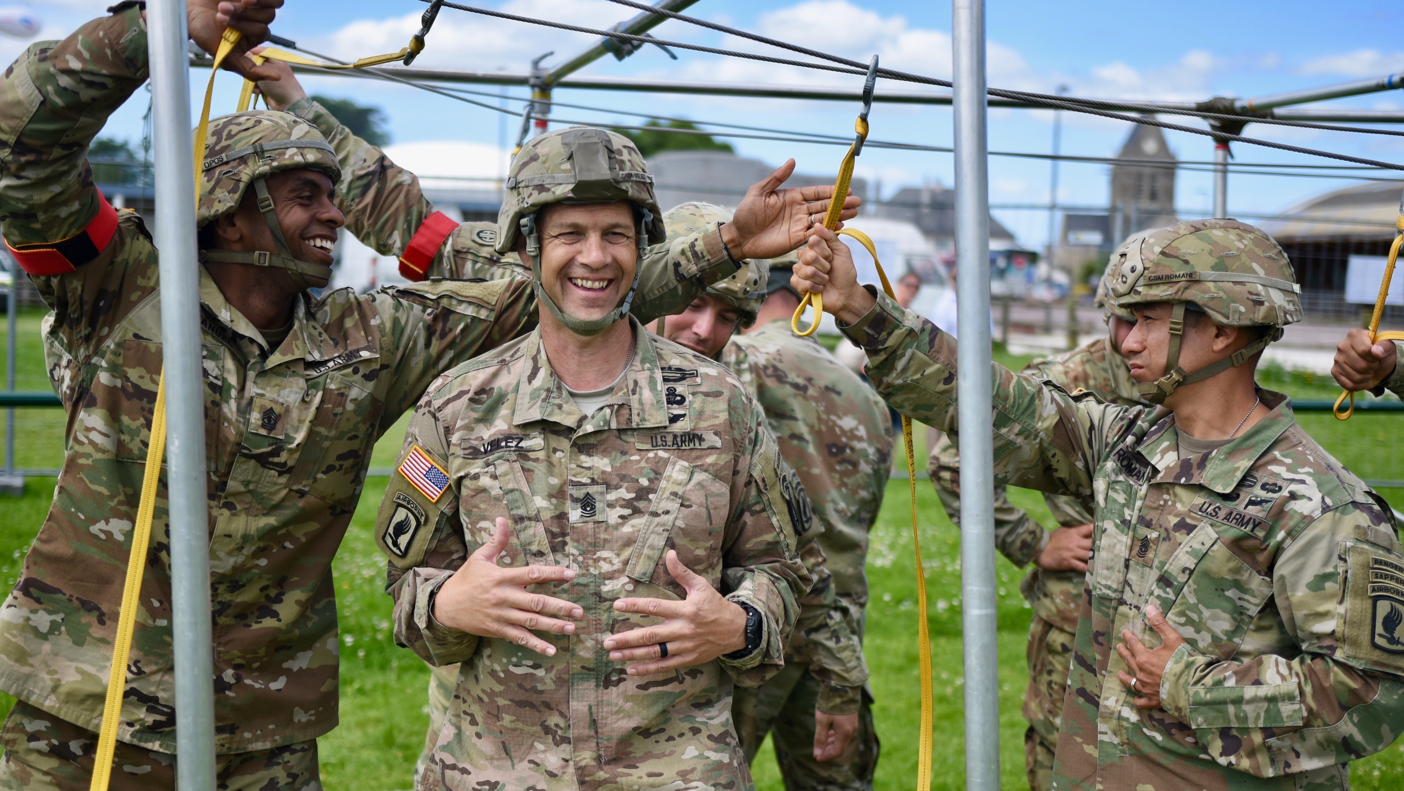 Command Sgt. Maj. Franklin Velez of the 173rd Airborne Brigade conducts pre-jump training on June 3, 2017 in Normandy, France. The airborne operation on June 4, 2017 commemorates the 73rd anniversary of D-Day, the largest multi-national amphibious landing and airborne operation in history. Overall, approximately 400 U.S. service members from units in Europe and the U.S. are participating in ceremonial D-Day 73 events from May 31 - June 7, 2017