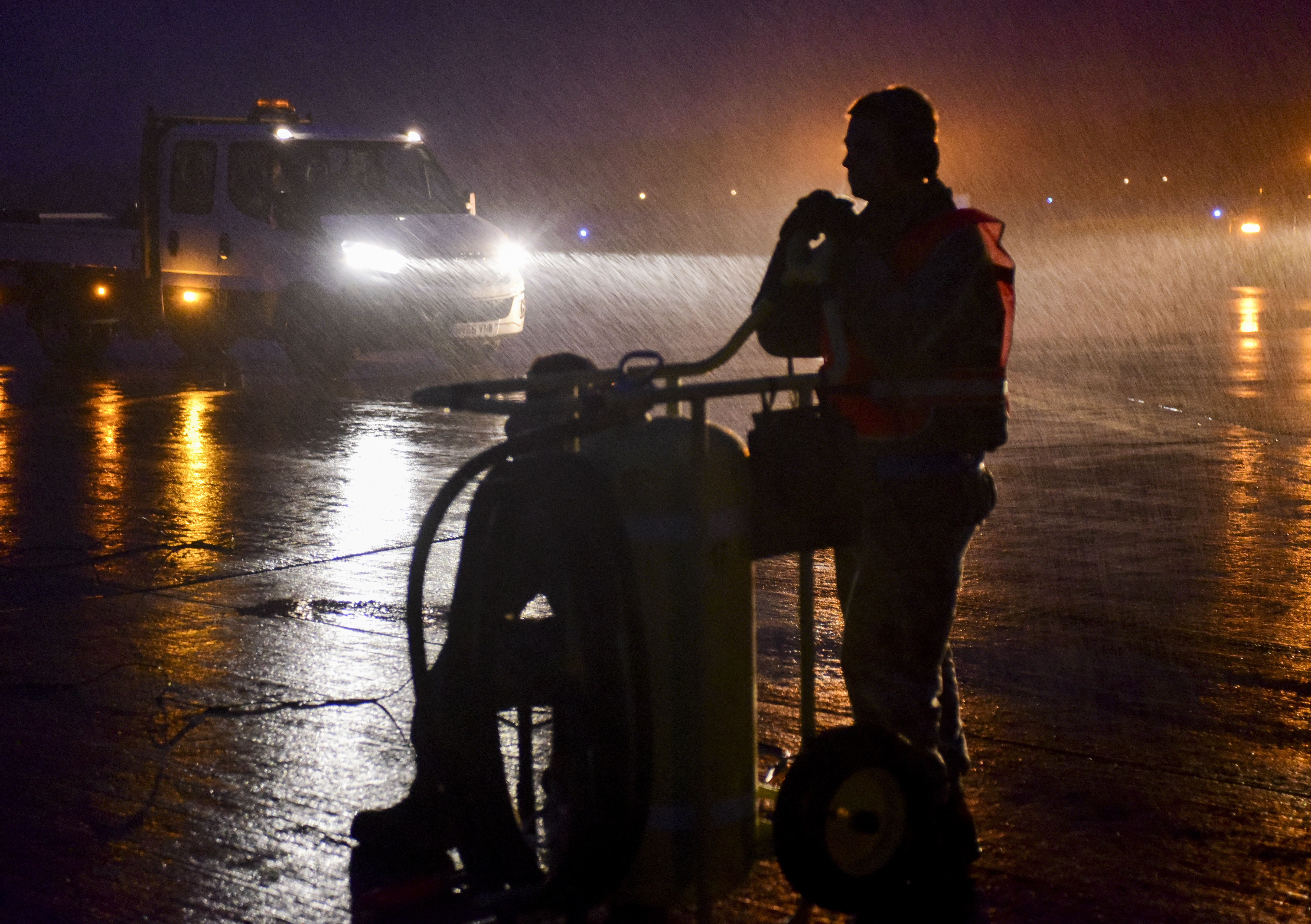 U.S. Air Force Senior Airmen Blake Nickells, 2nd Aircraft Maintenance Squadron assistant dedicated crew chief, waits out a storm while conducting pre-flight inspections on a B-52H Stratofortress at Royal Air Force Fairford, U.K., June 6, 2017. Exercises such as BALTOPS enable bomber crews to maintain a high state of readiness and proficiency and validate the bomber’s always-ready global strike capability. (U.S. Air Force photo by Airman 1st Class Randahl J. Jenson)