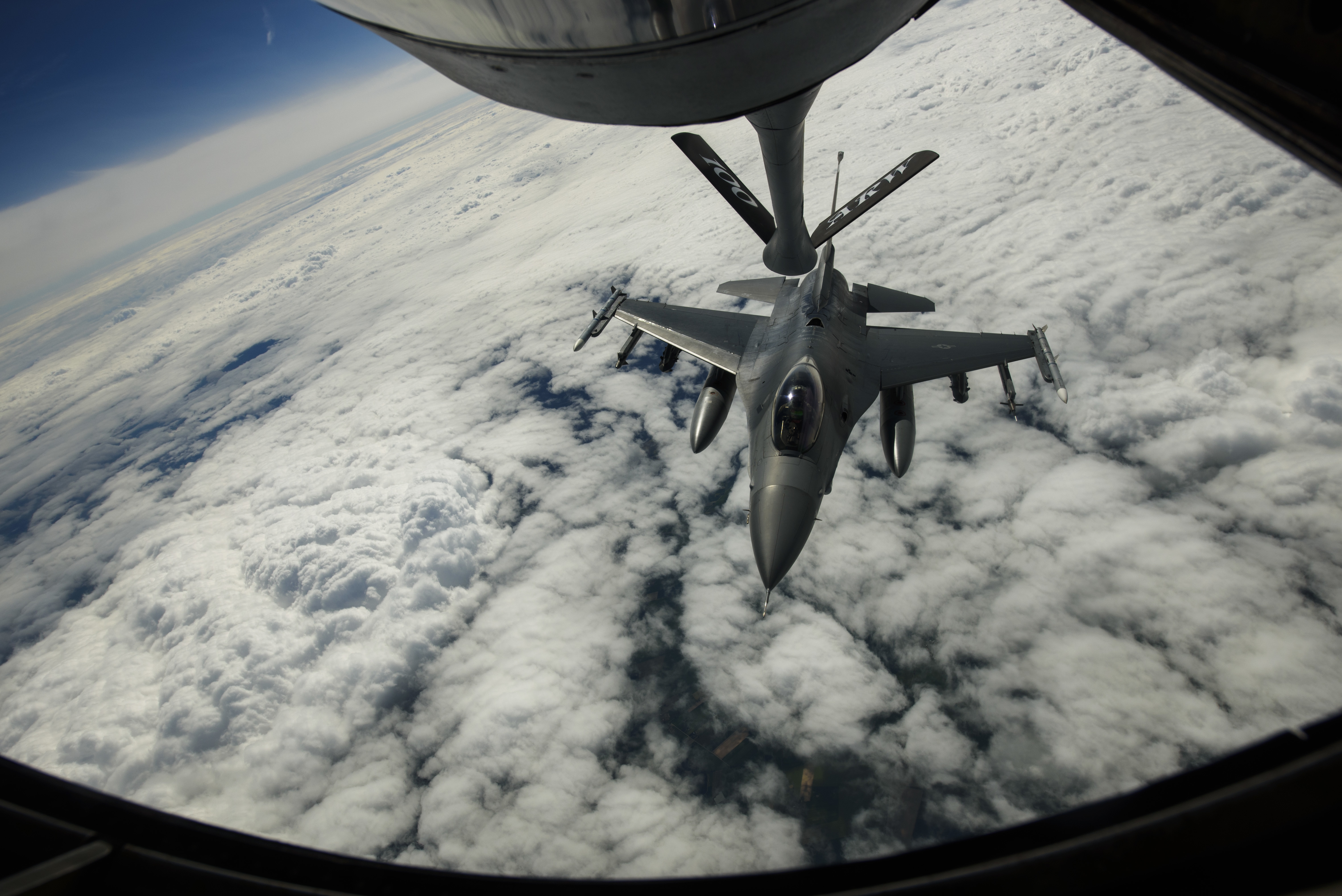 An F-16 Fighting Falcon. 510th Fighter Squadron, deployed to Krzesiny Air Base, Poland, in support of Aviation Detachment rotation 17-3, exercise BALTOPS and exercise Saber Strike approaches the boom on a KC-135R Stratotanker over the Baltic Sea, June 13, 2017. BALTOPS is an annually recurring multinational exercise designed to enhance flexibility and interoperability, as well as demonstrate resolve of allied and partner forces to defend the Baltic region. Participating nations include Belgium, Denmark, Estonia, Finland, France, Germany, Latvia, Lithuania, the Netherlands, Norway, Poland, Sweden, the United Kingdom, and the United States. (U.S. Air Force photo by Staff Sgt. Jonathan Snyder)