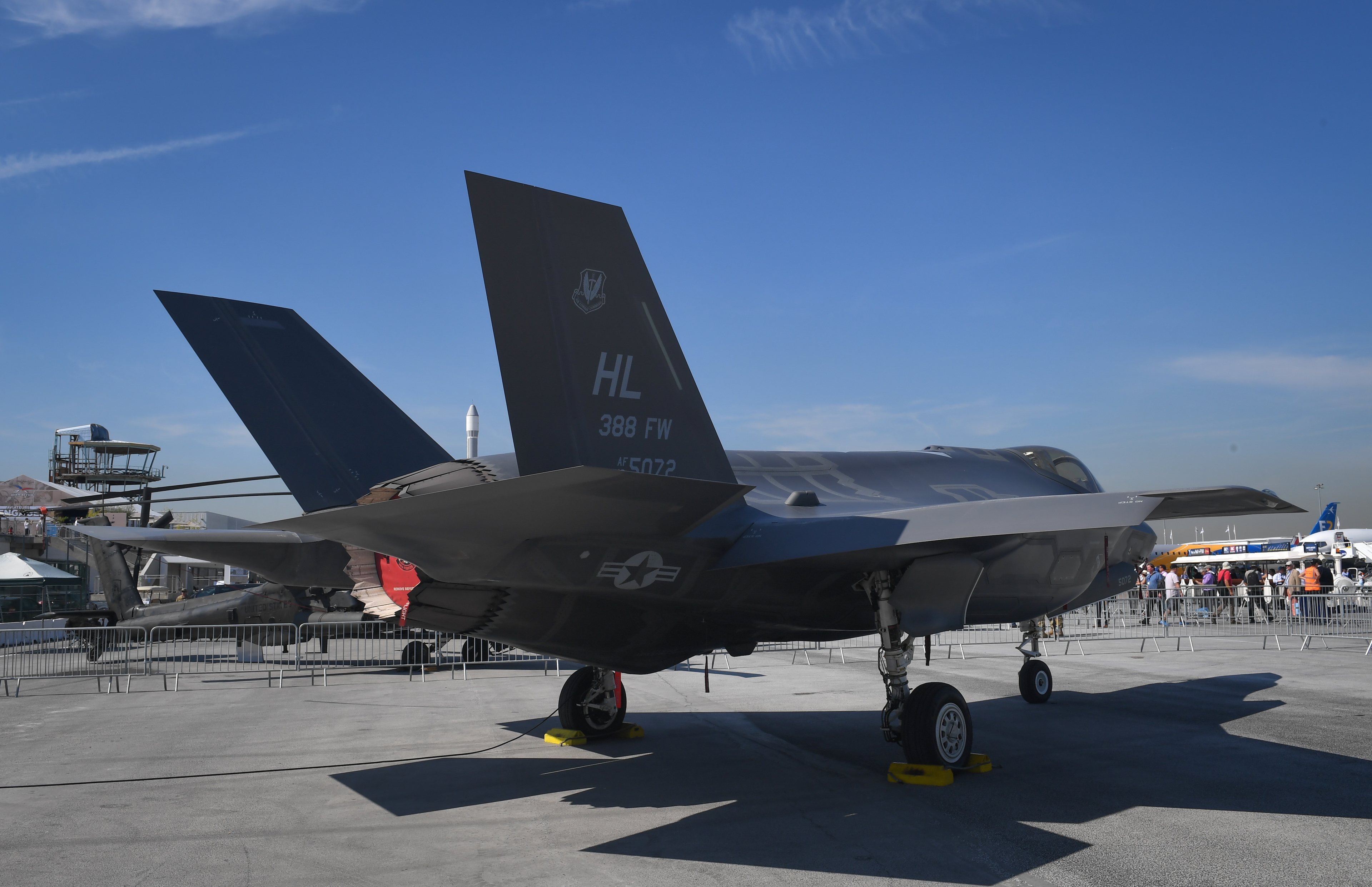 An F-35A Lightning II from Hill Air Force Base, Utah, is displayed in the U.S. corral at the Paris Air Show June 20, 2017 at Le Bourget, France. Aside from the F-35, the U.S. is displaying an F-16 Fighting Falcon, a CH-47 Chinook, an AH-64 Apache, a P-8 Poseidon, a C-130J Super Hercules and a CV-22 Osprey. The Paris Air Show offers the U.S. a unique opportunity to display their leadership in aerospeace and technology on an international scale. (U.S. Air Force photo/ Tech. Sgt. Ryan Crane)