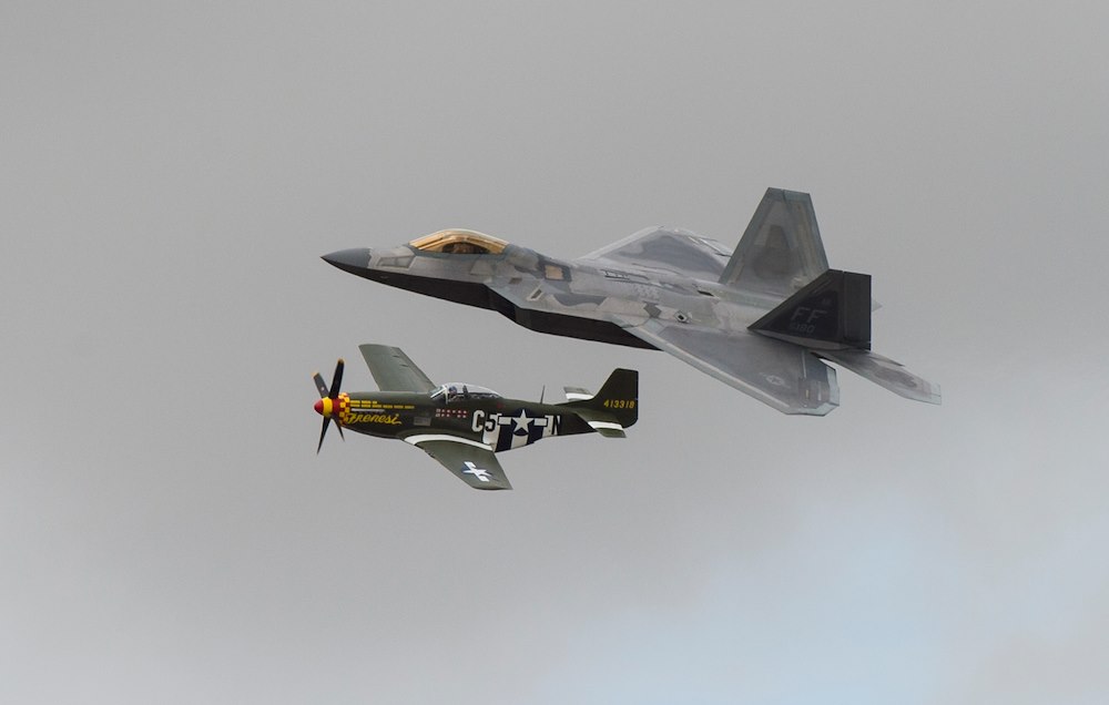 FAIRFORD, United Kingdom – A U.S. Air Force F-22 Raptor and P-51 Mustang fly past spectators during a U.S. Air Force heritage flight at the 2017 Royal International Air Tattoo (RIAT) located at RAF Fairford, United Kingdom, on July 16, 2017. This year commemorates the U.S. Air Force’s 70th Anniversary which was highlighted during RIAT by displaying its lineage and advancements in military aircraft. (U.S. Air Force Photo by Tech. Sgt. Brian Kimball)
