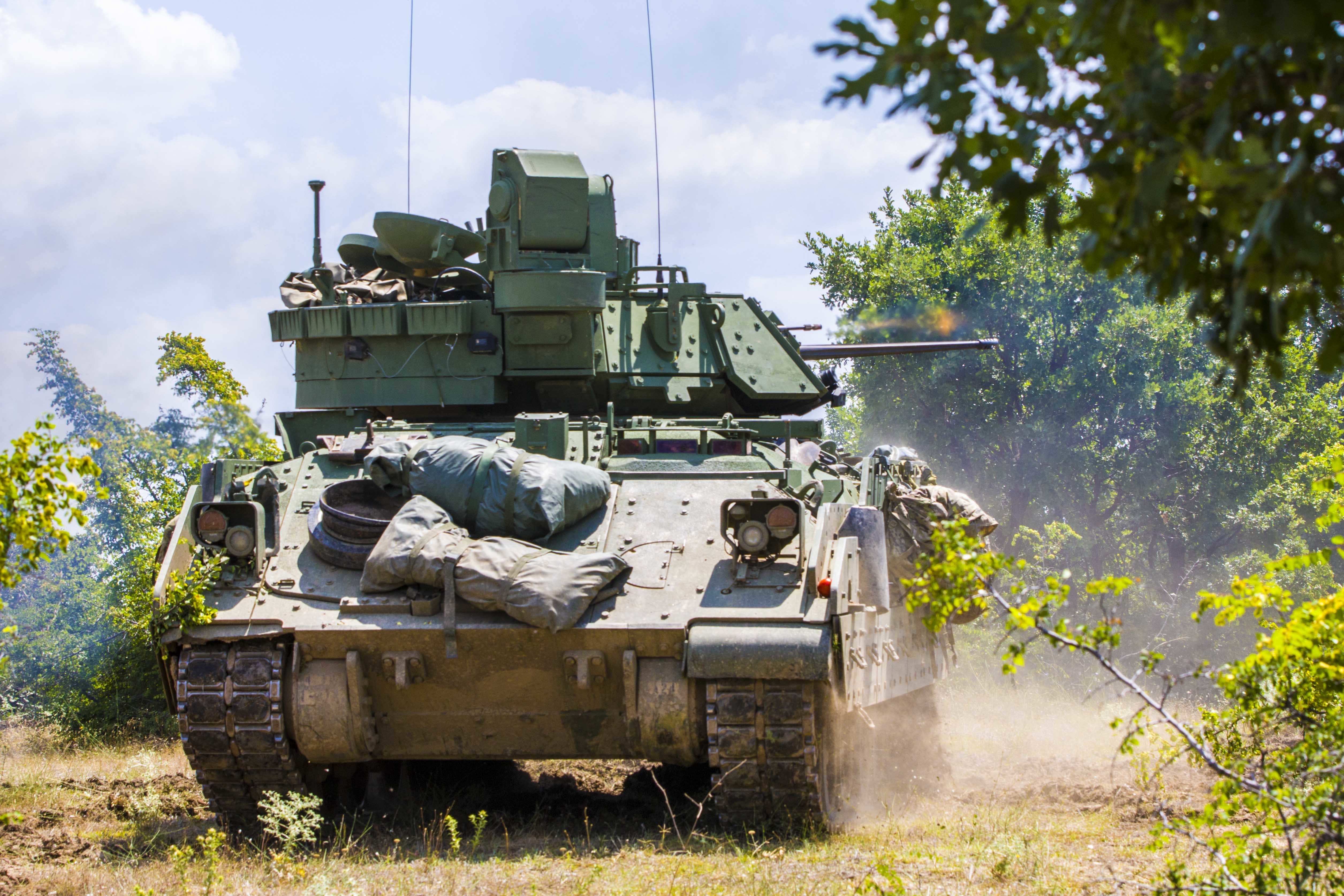 A Bradley Fighting Vehicle from 1st Battalion, 8th Infantry Regiment, 4th Infantry Division, fires on enemy forces during a combined live fire exercise titled Peace Sentinel at Koren, Bulgaria, on July 19. Exercise Saber Guardian 17 is a U.S. European Command, U.S. Army Europe-led exercise in the Black Sea Region that builds readiness and improves interoperability among the 20 Allies who participate. (U.S. Army photo by Spc. Thomas Scaggs) 170717-A-TZ475-446