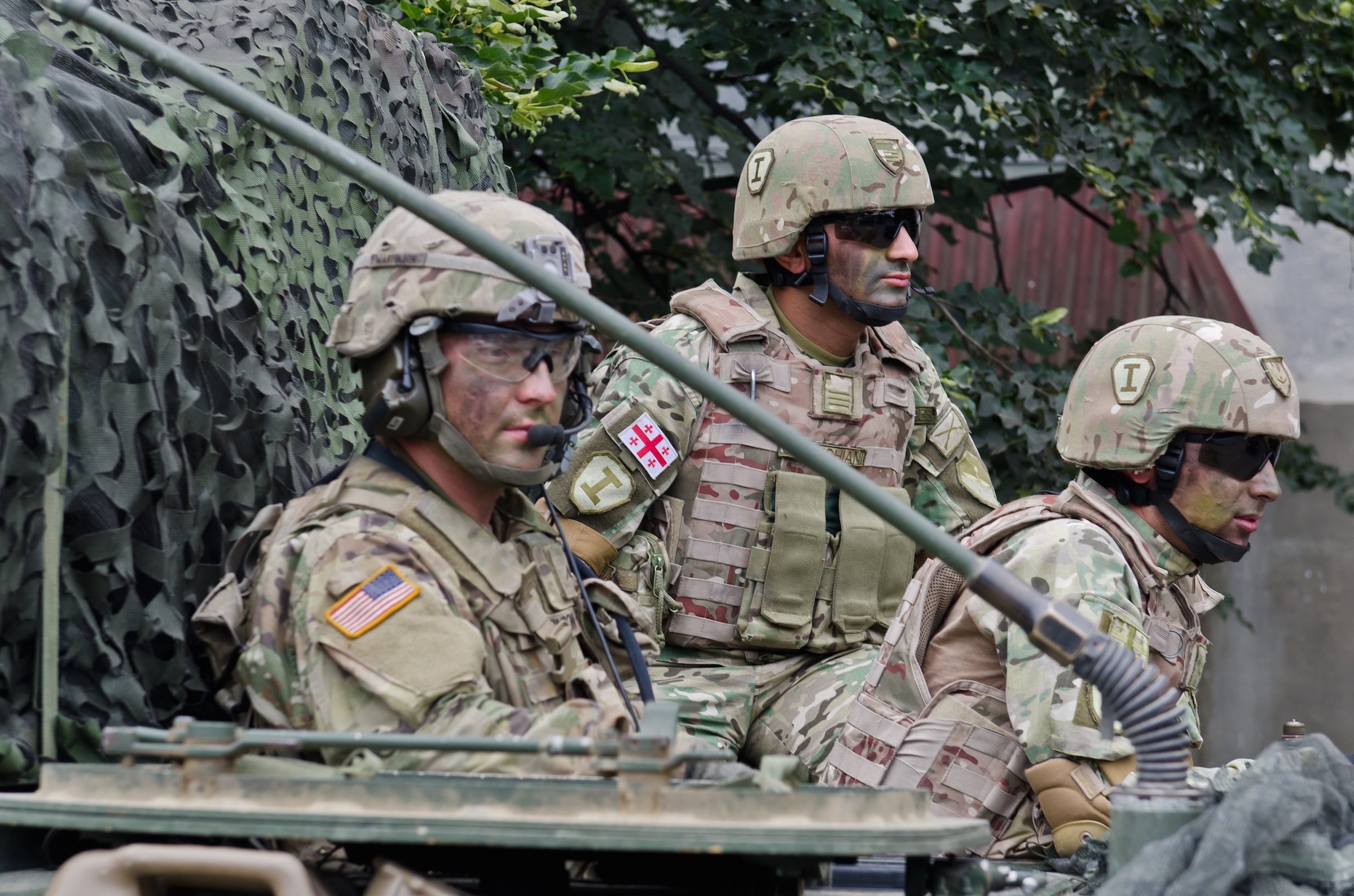U.S. and Georgian Soldiers position themselves in the rear airguard hatch of a Stryker during their movement from Poti, Georgia to Vaziani Training Area in Georgia for exercise Noble Partner. Noble Partner 17 is a European Rotational Force exercise of Georgia's light infantry company contribution to the NATO Response Force. The exercise provides participating nations with the opportunity to train in a multinational environment while enhancing cooperation and interoperability during realistic and challenging training events. (U.S. Army photo by Capt. John W. Strickland)