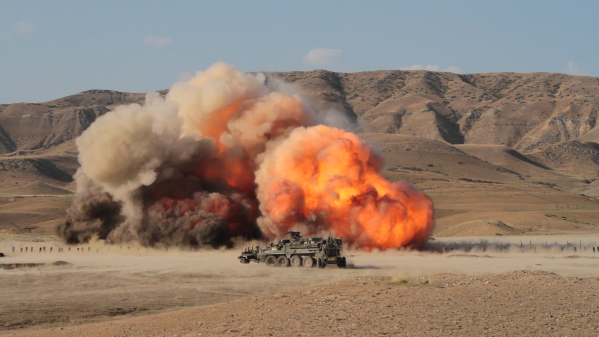 VAZIANI TRAINING AREA, Georgia — The Mine Clearing Line Charge (MICLIC) explodes in a Georgian obstacle during a rehearsal for the combined arms live fire, Vaziani Training Area, Georgia, Aug. 10, 2017. The live fire displays coordination between different assets and is a demonstration of combined capability. The live fire is the last training event before the closing of Exercise Noble Partner. Exercise Noble Partner is a multinational, U.S. Army Europe-led exercise conducting home station training for the Georgian light infantry company designated for the NATO Response Force. (U.S. Army photo by Sgt. Joshua Joyner)