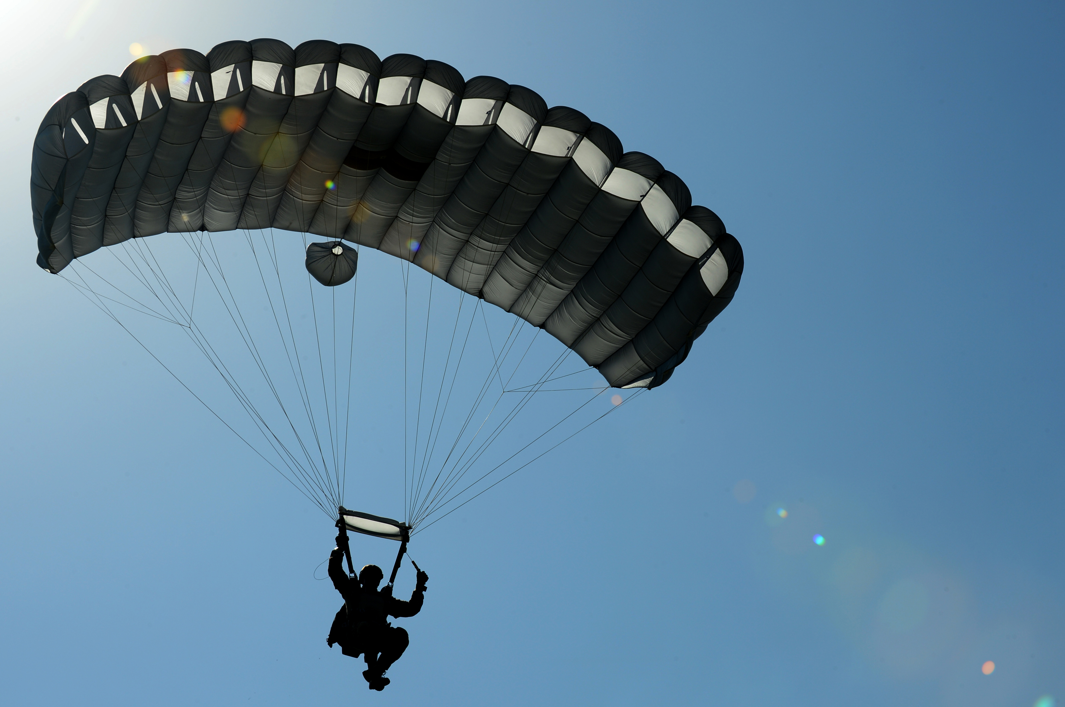 An Airman assigned to the 57th Rescue Squadron prepares to land after a freefall jump during exercise Ares Shadow near Aviano, Italy, Aug. 9. During the exercise, RAF Lakenheath pararescuemen and combat rescue officers recovered a simulated downed pilot and participated in multiple jumps. (U.S. Air Force photo/Airman 1st Class Eli Chevalier)