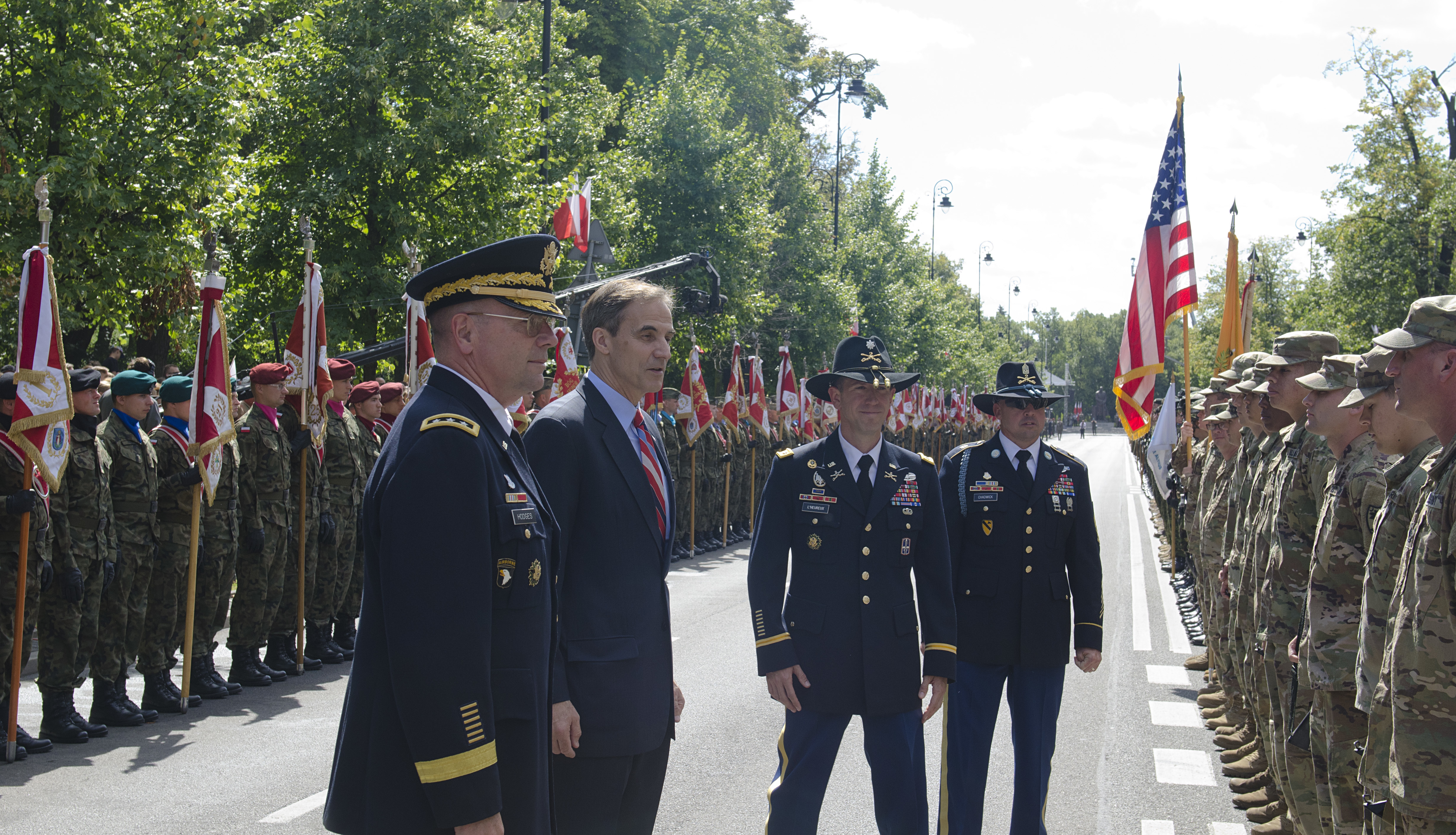 U.S. Ambassador to Poland, Paul W. Jones and Commanding General of U.S. Army Europe, Lt. Gen. Ben Hodges thanked the Soldiers assigned to the 497th Combat Sustainment Support Battalion for participating in 97th anniversary of the Battle of Warsaw Aug. 15, 2017, in Warsaw, Poland. This national holiday in Poland, known as the Feast of the Polish Armed Forces, included Soldiers from Canada, Estonia, Romania, United States and the United Kingdom. As part of the unified Alliance, the NATO Soldiers and their collective combat vehicles participated in the annual Polish parade to celebrate that historic victory and honor active duty services members, veterans and fallen Soldiers.