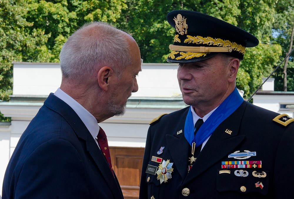 Minister of National Defense, Antoni Macierewicz thanked the Commanding General of U.S. Army Europe, Lt. Gen. Ben Hodges for his service during the 97th anniversary of the Battle of Warsaw Aug. 15, 2017, in Warsaw, Poland. This national holiday in Poland, known as the Feast of the Polish Armed Forces, which included soldiers from Canada, Estonia, Romania, United States and the United Kingdom. As part of the unified Alliance, the NATO Soldiers and their collective combat vehicles participated in the annual Polish parade to celebrate that historic victory and honor active duty services members, veterans and fallen Soldiers.