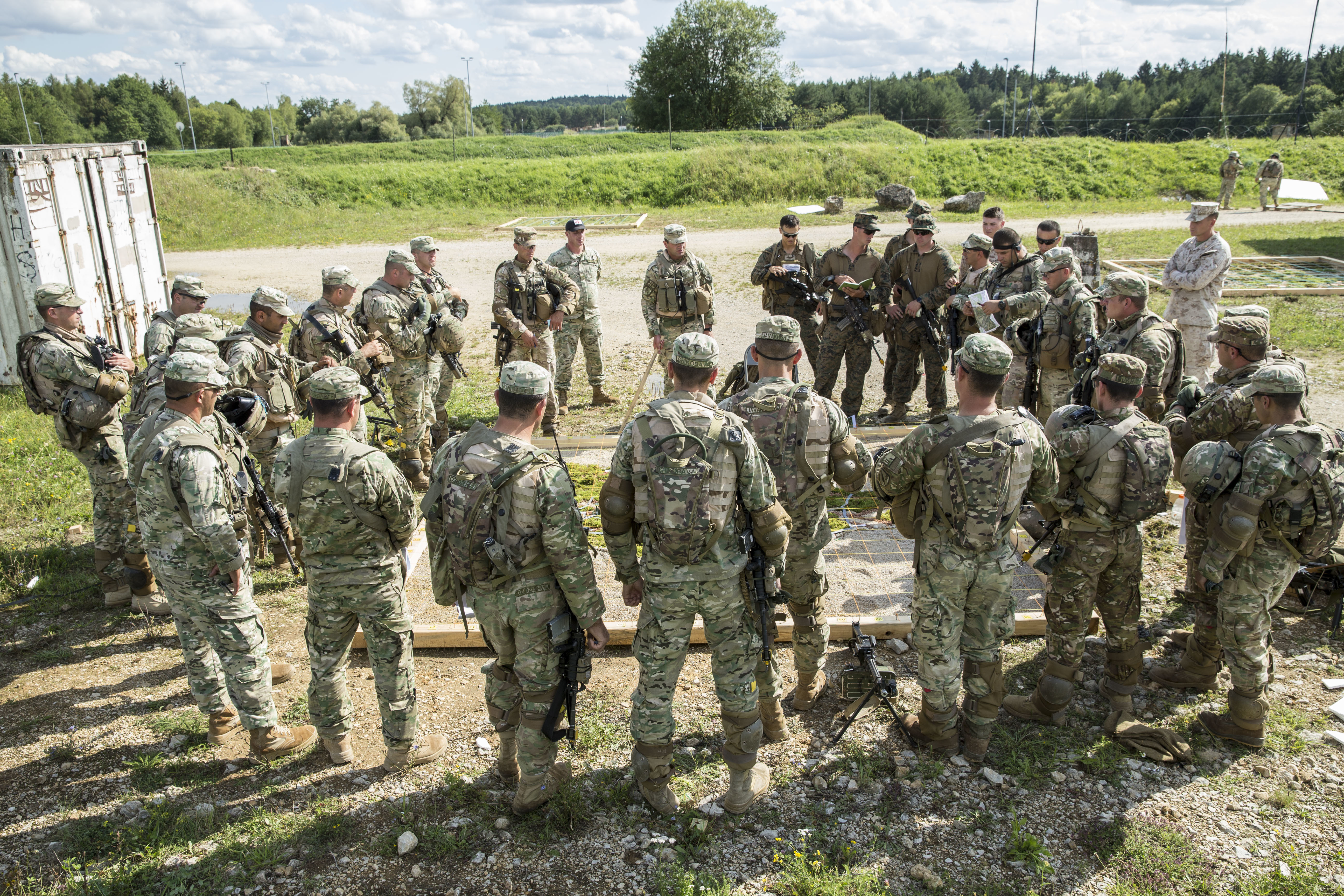 HOHENFELS, Germany - U.S. Marines with 6th Air Naval Gunfire Liaison Company, Force Headquarters Group, Marine Forces Reserve, and soldiers with the 31st Georgian Light Infantry Battalion, discuss troop movements over a terrain model after conducting a patrol during the Georgia Deployment Program- Resolute Support Mission, Mission Rehearsal Exercise aboard the Joint Multinational Readiness Center, Hohenfels, Germany, Aug. 16, 2017. MARFORRES Marines play a key role in the partnership with the Georgian Armed Forces, preparing the 31st Georgian Light Infantry Battalion to deploy to Afghanistan in support of Operation Freedom’s Sentinel, and deploying alongside them. (U.S. Marine Corps photo by Cpl. Kimberly Aguirre/Released)