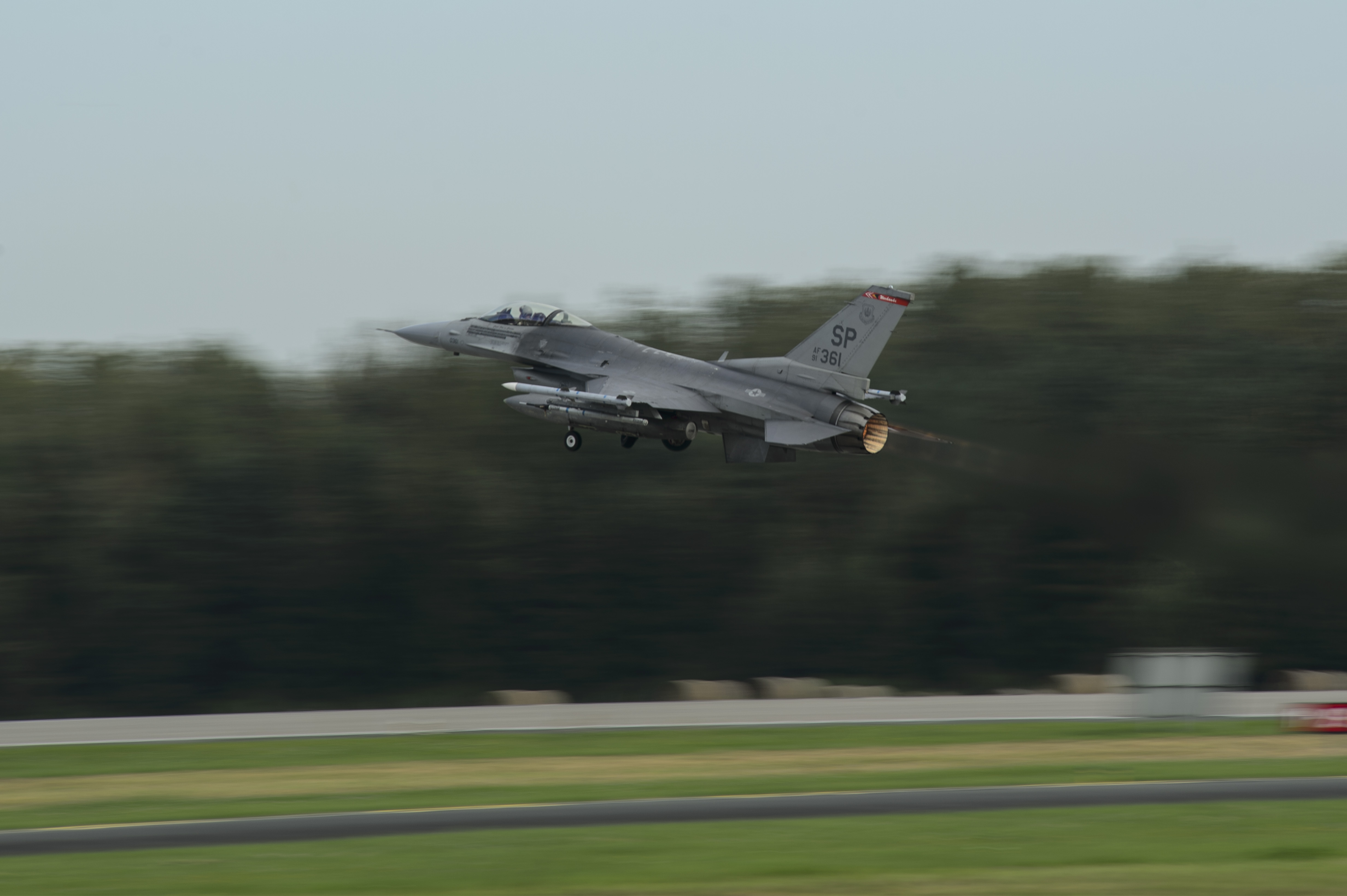 A U.S. Air Force F-16 Fighting Falcon assigned to the 480th Fighter Squadron takes off at Krzesiny Air Base, Poland, Sept. 12, 2017. The 480th FS is participating in bilateral training with the Polish Air Force, hosted by the 52nd Operations Group, Det. 1 in support of Operation Atlantic Resolve. (U.S. Air Force photo by Staff Sgt. Jonathan Snyder)