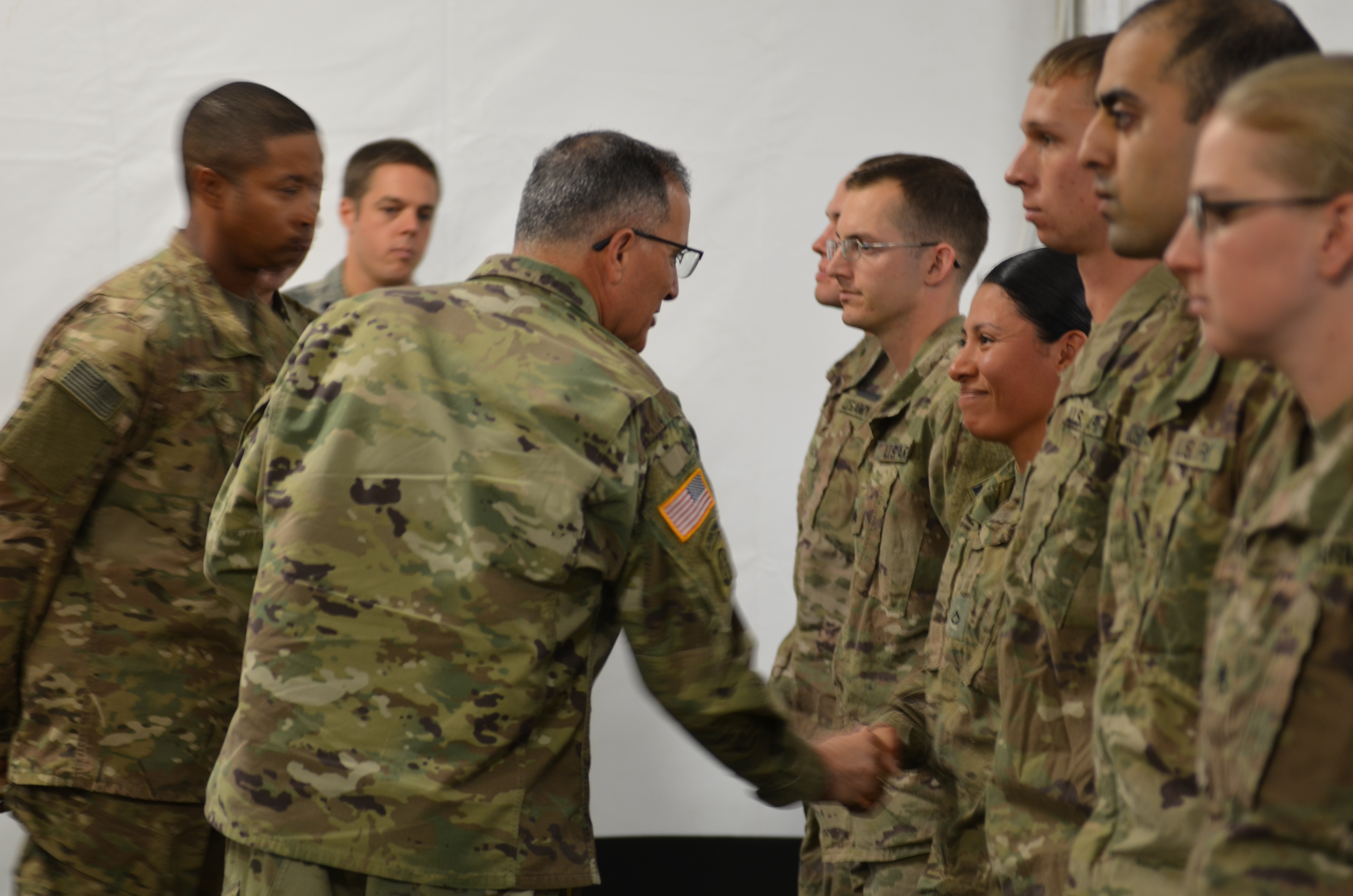 CAMP KARLIKI, Poland — Soldiers from 4th Infantry Division and 1st Infantry Division, are awarded coins by General Curtis Scaparrotti, the commander of the U.S. European Command and the Supreme Allied Commander Europe of NATO Allied Command Operations, on Camp Karliki, Poland, Sep. 22. Soldiers from both units are recognized for exemplary behavior and performance, prior to or during their unit's rotation. Scaparrotti stops at the location for a short visit with the Soldiers before attending a brief on the incoming unit's progress and plans to move forward. The units are in Europe operating under Atlantic Resolve. Atlantic Resolve demonstrates the U.S. commitment to NATO by rotating U.S. -based units through the European theater and training with NATO partners and Allies. (U.S. Army photo by Sgt. Shiloh Capers)