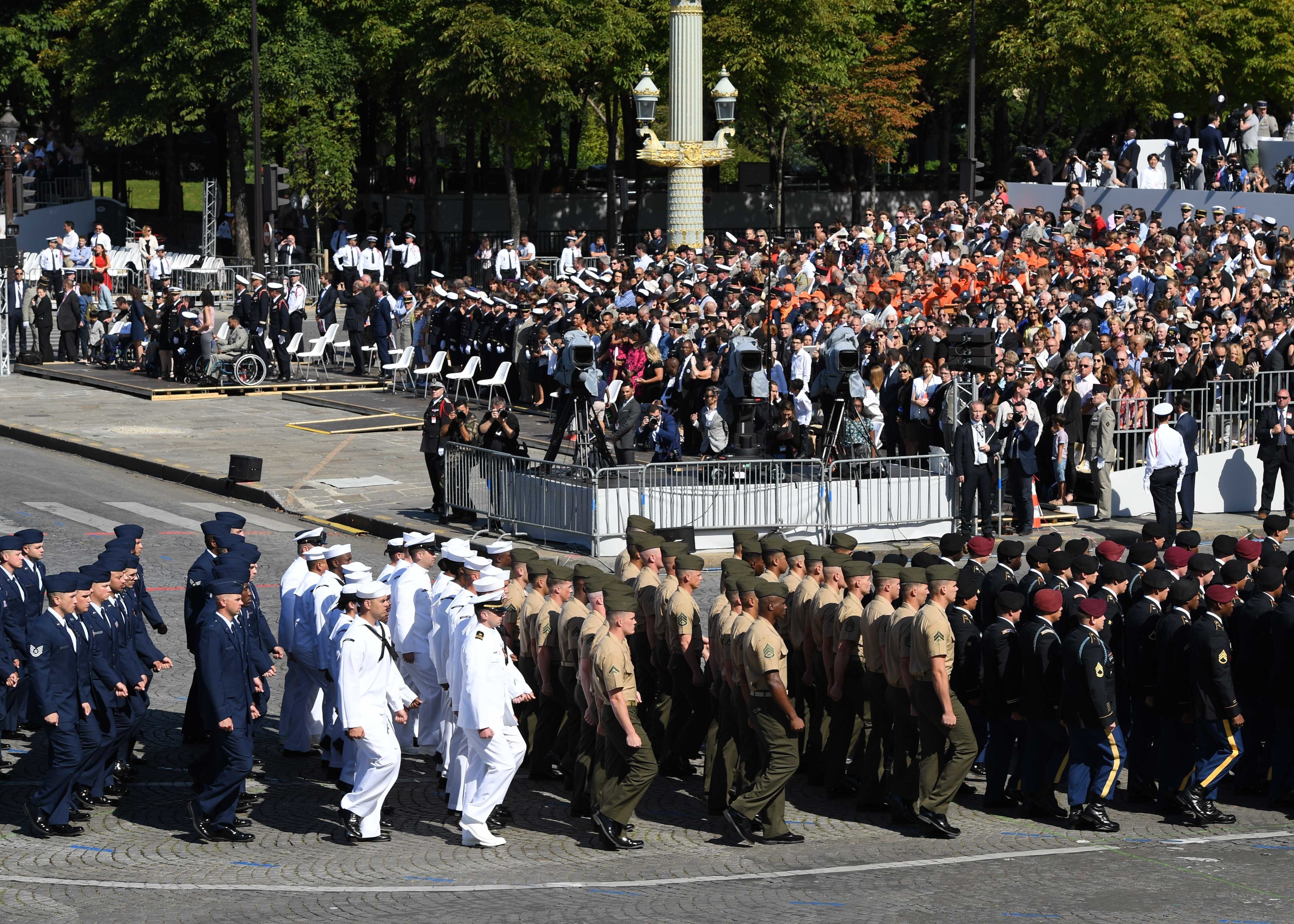 170714-N-AC979-386 PARIS (July 14, 2017) Almost 200 U.S. Soldiers, Sailors, Marines and Airmen assigned to units in Europe and the 1st Infantry Division, Fort Riley, Kansas, march in front of the Presidential Tribune, officiated by French President Emmanuel Macron and U.S. President Donald Trump, at the Place de la Concorde during the Military Parade on Bastille Day. An historic first, the U.S. led the parade as the country of honor this year in commemoration of the centennial of U.S. entry into World War I and the long-standing partnership between France and the U.S. (U.S. Navy photo by Chief Mass Communication Specialist Michael McNabb/Released)