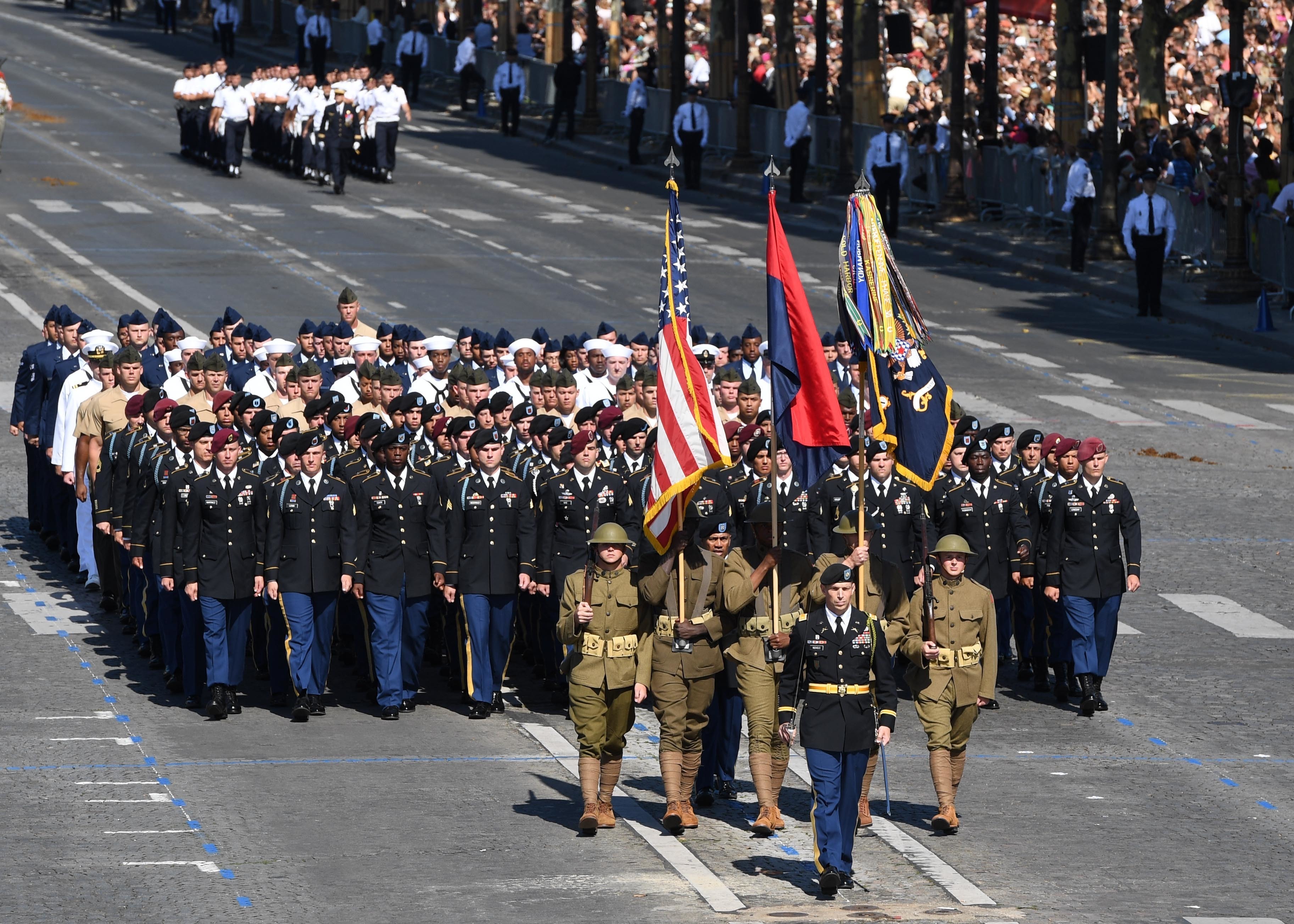 170714-N-AC979-381 PARIS (July 14, 2017) Almost 200 U.S. Soldiers, Sailors, Marines and Airmen assigned to units in Europe and the 1st Infantry Division, Fort Riley, Kansas, march down the Avenue des Champs-Élysées from the Arc de Triomphe to the Place de la Concorde during the Military Parade on Bastille Day. An historic first, the U.S. led the parade as the country of honor this year in commemoration of the centennial of U.S. entry into World War I and the long-standing partnership between France and the U.S. (U.S. Navy photo by Chief Mass Communication Specialist Michael McNabb/Released)