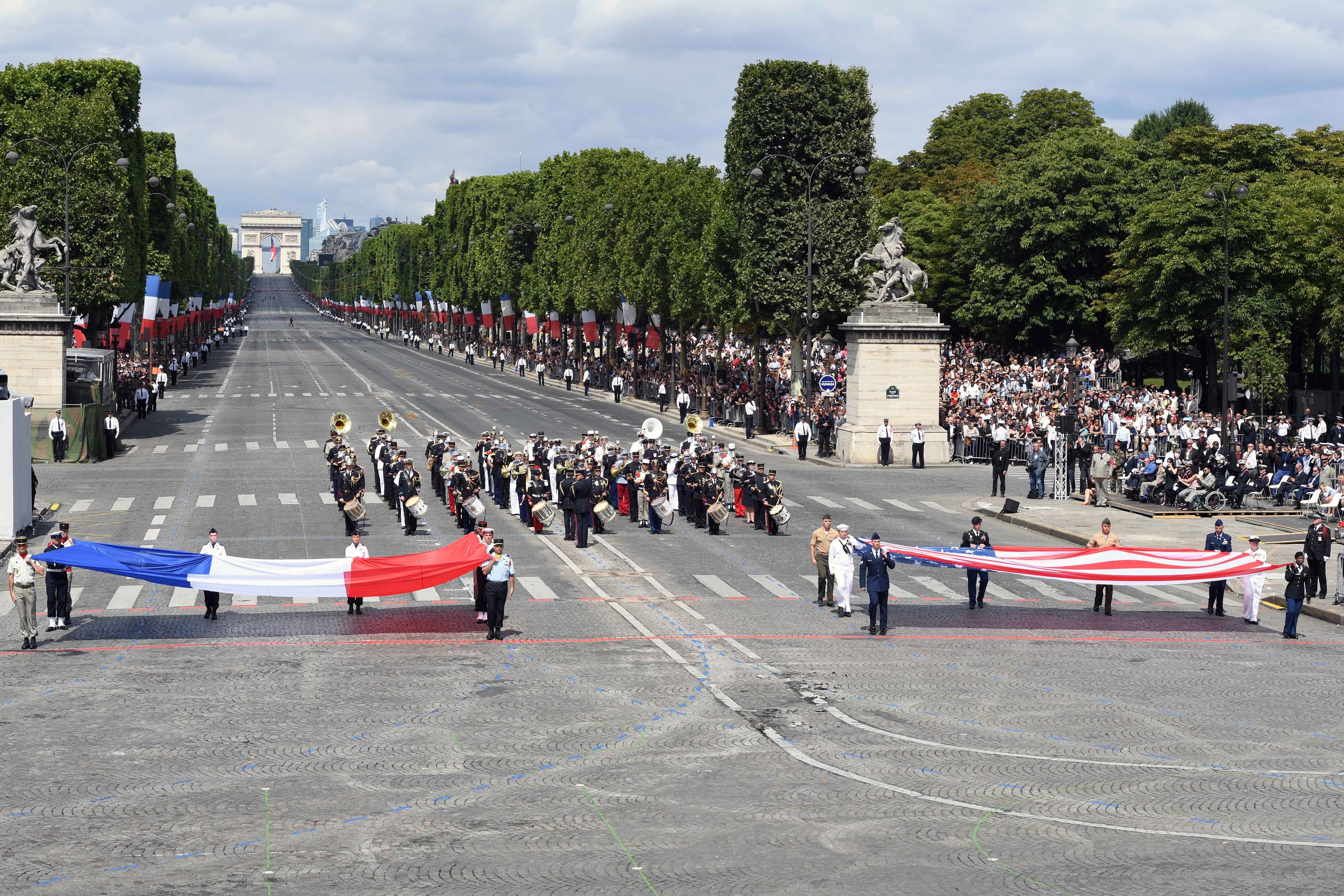 170714-N-AC979-495 PARIS (July 14, 2017) U.S. and French service members display each country’s respective flag during the Military Parade on Bastille Day. An historic first, the U.S. led the parade as the country of honor this year in commemoration of the centennial of U.S. entry into World War I and the long-standing partnership between France and the U.S. (U.S. Navy photo by Chief Mass Communication Specialist Michael McNabb/Released)