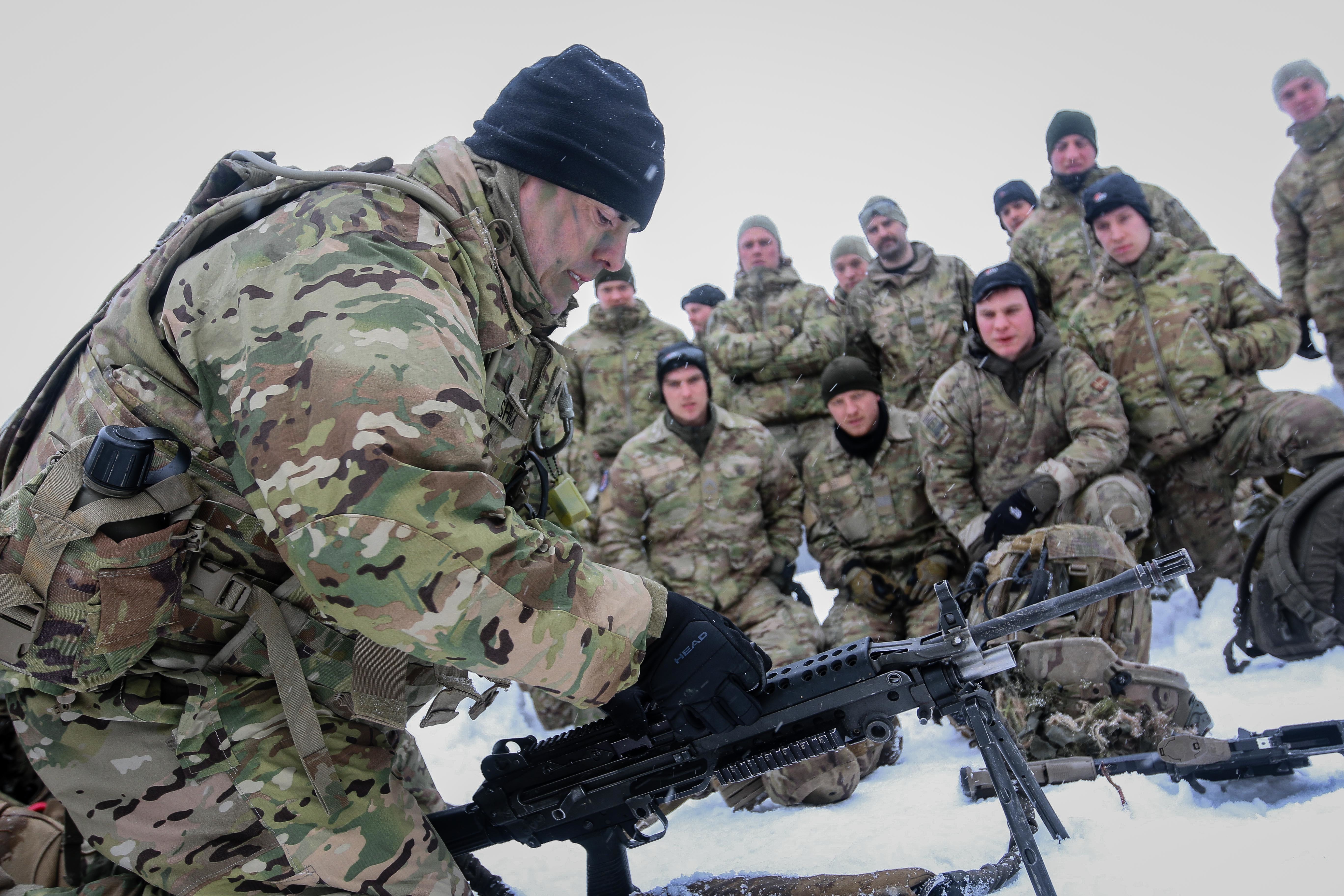 U.S. Army Staff Sgt. Jason Shick (left), an Erie, Pennsylvania native and a chemical, biological, radiological, and nuclear specialist with the 82nd Brigade Engineer Battalion, 2nd Armored Brigade Combat Team, 1st Infantry Division, teaches Danish soldiers of the Danish Vidar Company, Guard Hussars Regiment, how to use an M249 Light Machine Gun during a multinational weapons training session in Tapa, Estonia, March 10, 2018 as part of a rapid response readiness exercise in support of Atlantic Resolve. (U.S. Army photo by Spc. Hubert D. Delany III/22nd Mobile Public Affairs Detachment)