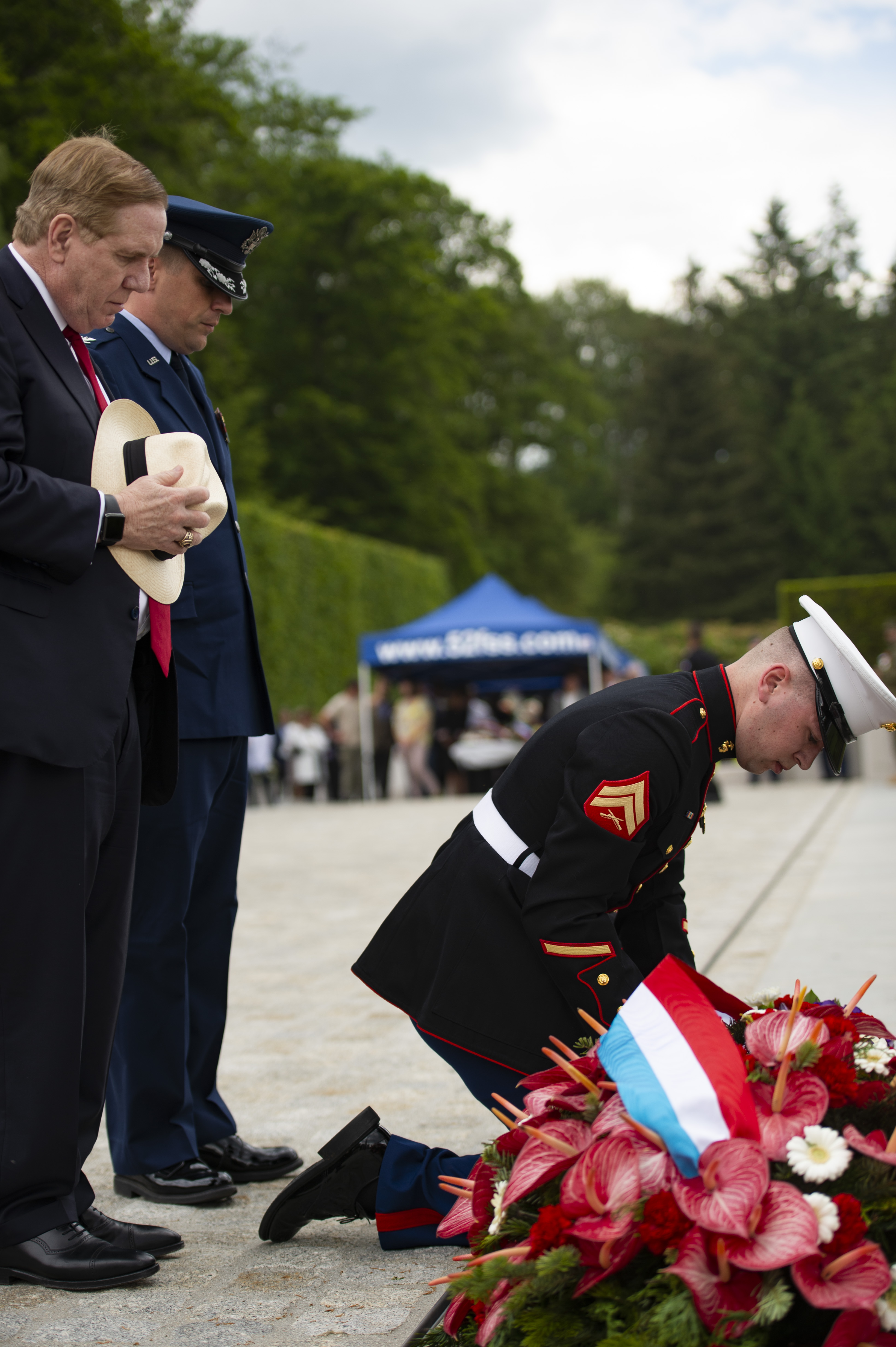 His Excellency, U.S. Ambassador to Luxembourg, J. Randolph Evans, and U.S. Embassies of Belgium and Luxembourg Assistant Army Attaché, Maj Keith Helms, pay respects during a wreath laying ceremony at the Luxembourg American Cemetery in Luxembourg, May 25, 2019. Throughout the course of U.S. history, service members have paid the ultimate price in defense of our Nation. Memorial Day is a time to honor their sacrifice and remember their legacy. This Memorial Day weekend, service members from United States European Command will participate in ceremonies at 21 American WWI and WWII military cemeteries across Europe. This year marks the 75th anniversary of WWII. The partnerships forged 75 years ago endure today as U.S. forces in Europe remain committed to European allies and partners. (U.S. Navy phot by Mass Communication Specialist 2nd Class Evan Parker/ Released)