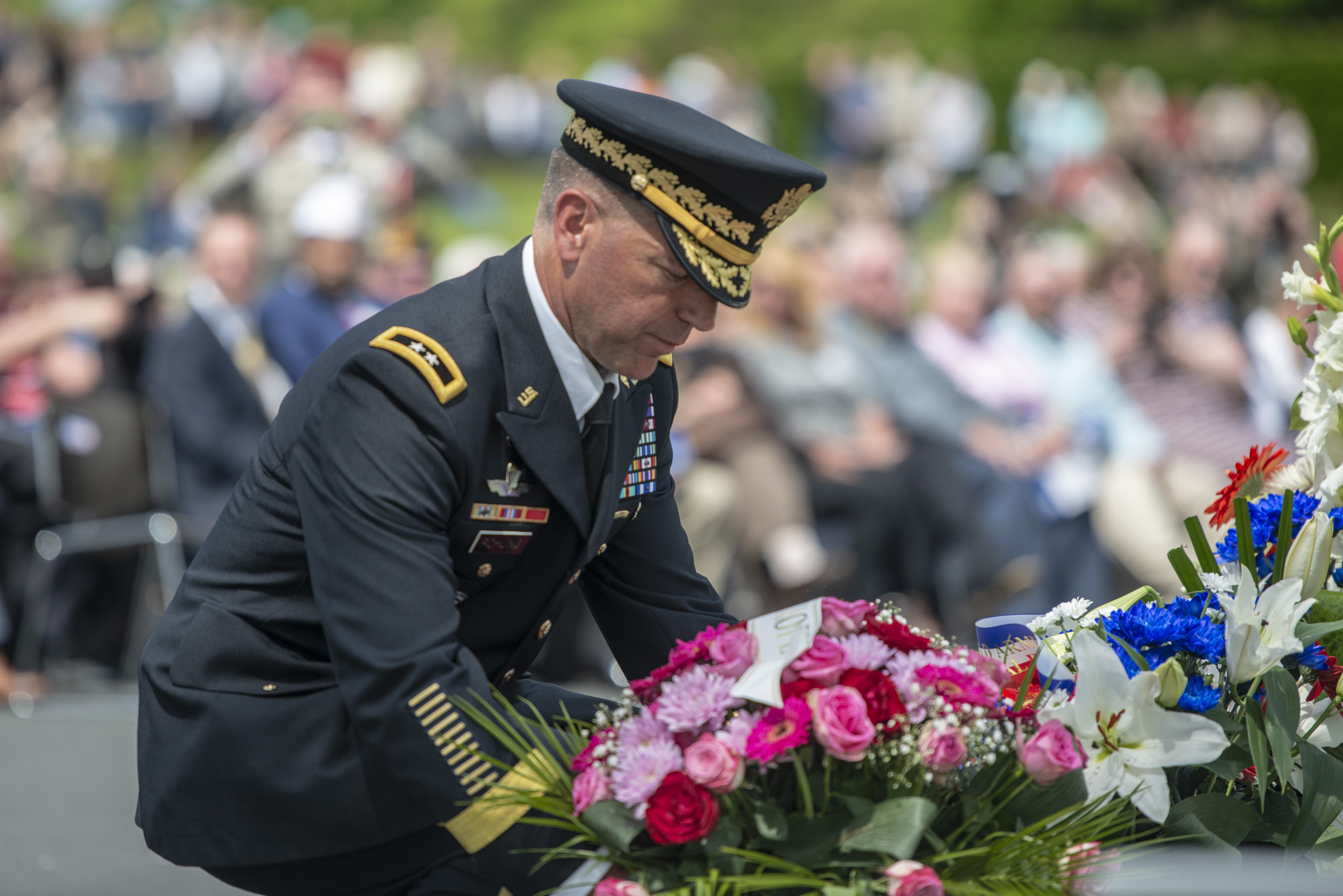 Major General Andrew Rohling, Deputy Commanding General U.S. Army Europe, lays a wreath to commemorate the men and women who gave their lives in service of their country during WWII at a Memorial Day ceremony at the Lorraine American Cemetery in Saint-Avold, France, May 24, 2019. Throughout the course of U.S. history, service members have paid the ultimate price in defense of our Nation. Memorial Day is a time to honor their sacrifice and remember their legacy. This Memorial Day weekend, service members from United States European Command will participate in ceremonies at 21 American WWI and WWII military cemeteries across Europe. This year marks the 75th anniversary of WWII. The partnerships forged 75 years ago endure today as U.S. forces in Europe remain committed to European allies and partners.