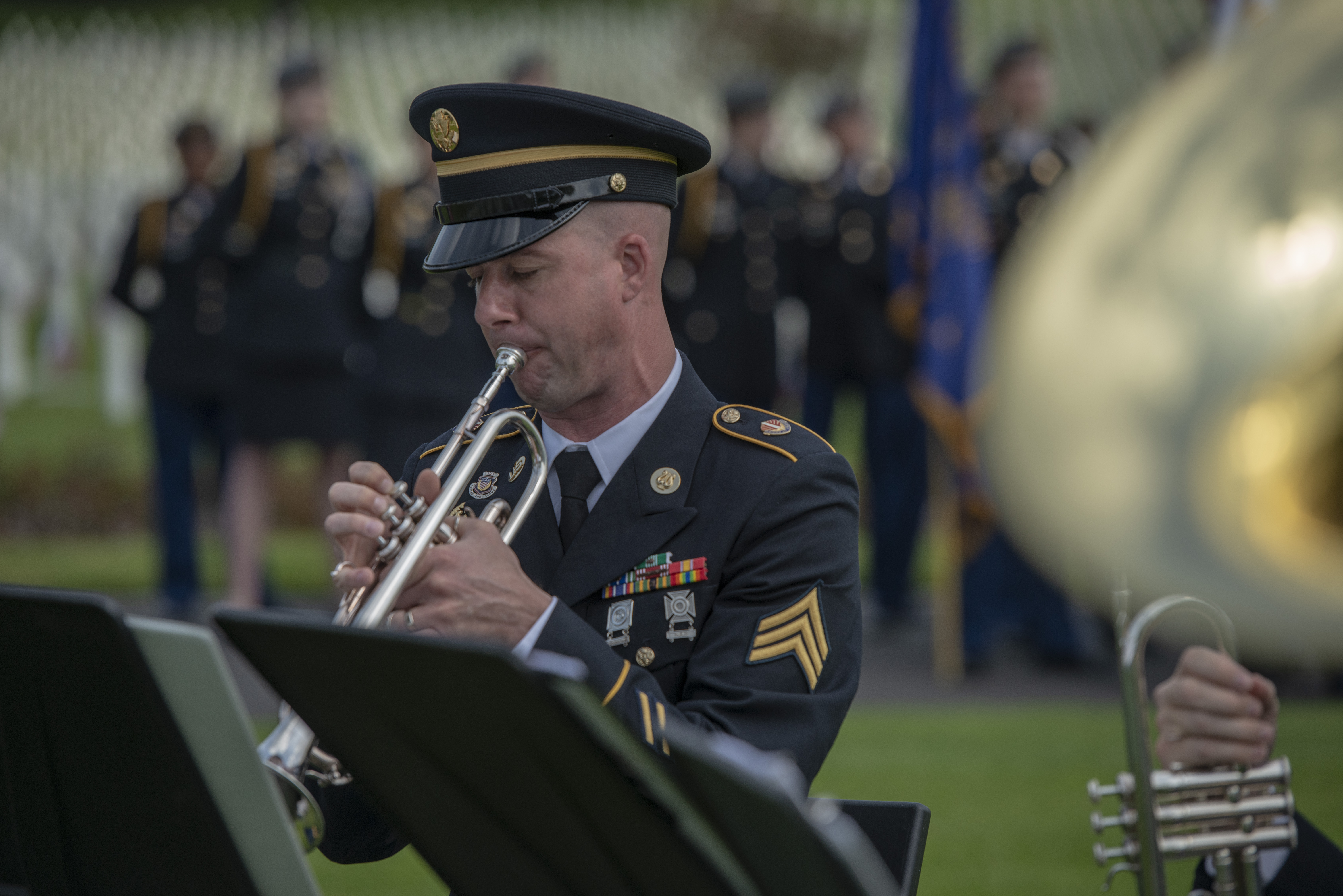 U.S. Army Europe Band plays during a Memorial Day ceremony at the Lorraine American Cemetery in Saint-Avold, France, May 24, 2019. Throughout the course of U.S. history, service members have paid the ultimate price in defense of our Nation. Memorial Day is a time to honor their sacrifice and remember their legacy. This Memorial Day weekend, service members from United States European Command will participate in ceremonies at 21 American WWI and WWII military cemeteries across Europe. This year marks the 75th anniversary of WWII. The partnerships forged 75 years ago endure today as U.S. forces in Europe remain committed to European allies and partners.