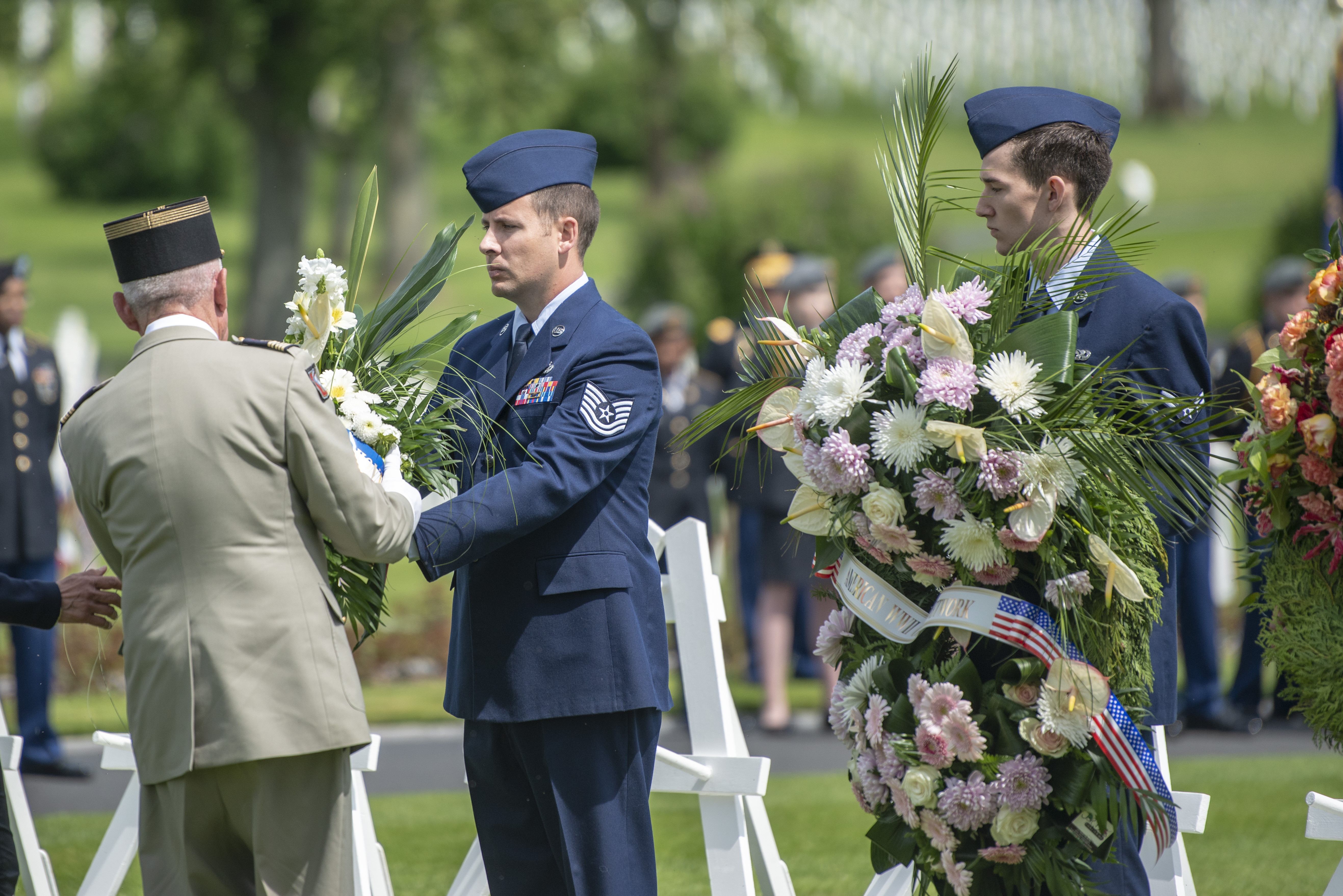 U.S. Airmen of the 52nd Fighter Wing presend wreaths during a Memorial Day ceremony at the Lorraine American Cemetery in Saint-Avold, France, May 24, 2019. Throughout the course of U.S. history, service members have paid the ultimate price in defense of our Nation. Memorial Day is a time to honor their sacrifice and remember their legacy. This Memorial Day weekend, service members from United States European Command will participate in ceremonies at 21 American WWI and WWII military cemeteries across Europe. This year marks the 75th anniversary of WWII. The partnerships forged 75 years ago endure today as U.S. forces in Europe remain committed to European allies and partners.