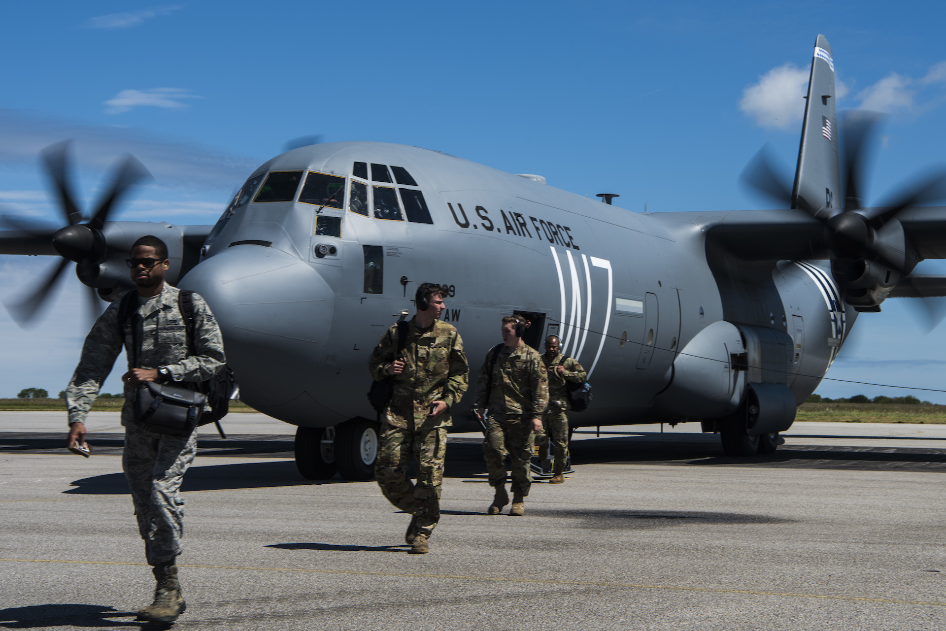 Members of Team Ramstein exit from a U.S. Air Force C-130J Super Hercules, assigned to the 37th Airlift Squadron, Ramstein Air Base, Germany, at Cherbourg-Maupertus Airport, France, May 30, 2019. The men and women of the U.S. military remain forever indebted to World War II veterans who demonstrated selfless service and sacrifice that characterize the greatest generation in denfense of global peace and security. (U.S. Air Force photo by Senior Airman Kristof J. Rixmann)