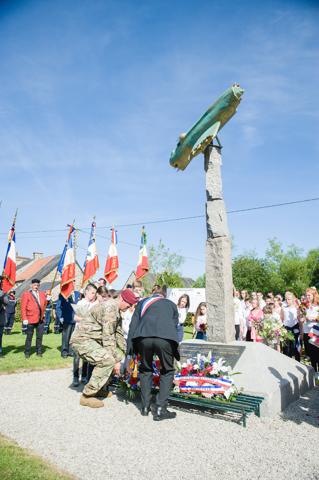 A U.S. Army Paratrooper and French official lay a wreath at the base of a memorial during a ceremony in Bricquebec-en-Contin, France, June 1, 2019. The annual ceremony is held to honor the lives of crewmen of the two B-17’s that were shot down near the towns of Bricquebec and Rocheville.