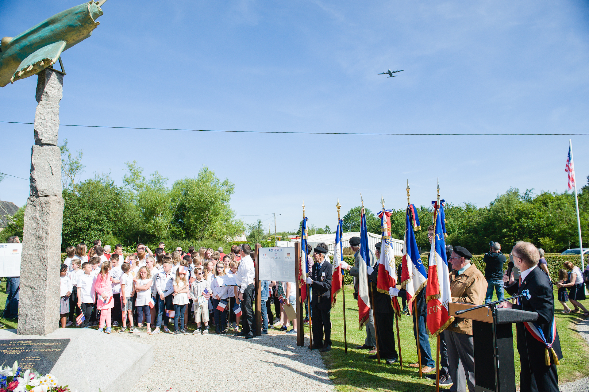 A U.S. Air Force C-130 flies over a memorial ceremony in Bricquebec-en-Contin, France, June 1, 2019. The annual ceremony is held to honor the lives of crewmen of the two B-17’s that were shot down near the towns of Bricquebec and Rocheville.