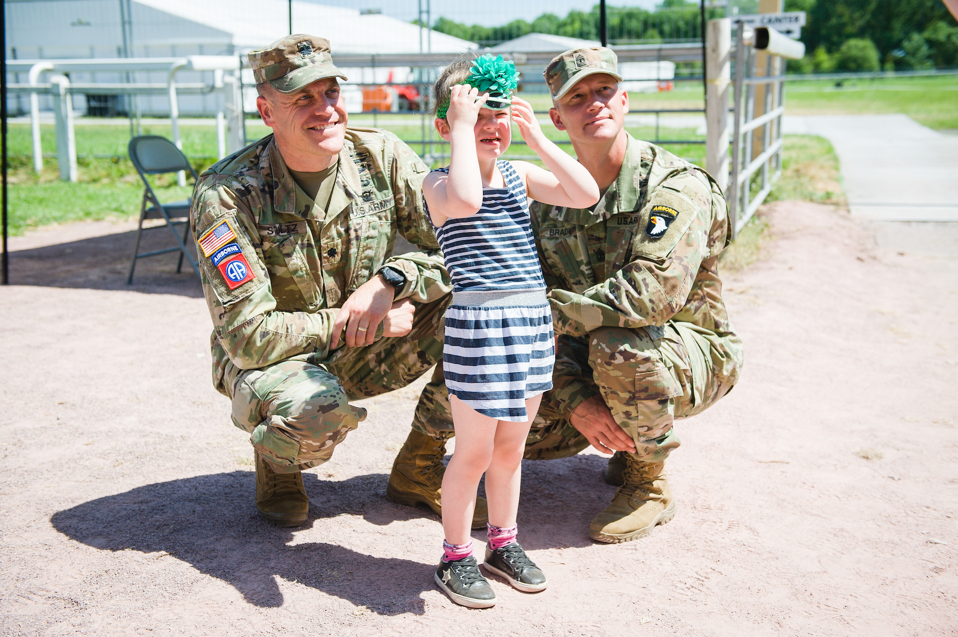 U.S. Army soldiers assigned to the 101st Airborne Division take a picture with a young French girl at the Carentan Logistic Support Area at Hippodrome Maurice de Folleville in Carentan, France, June 1, 2019.