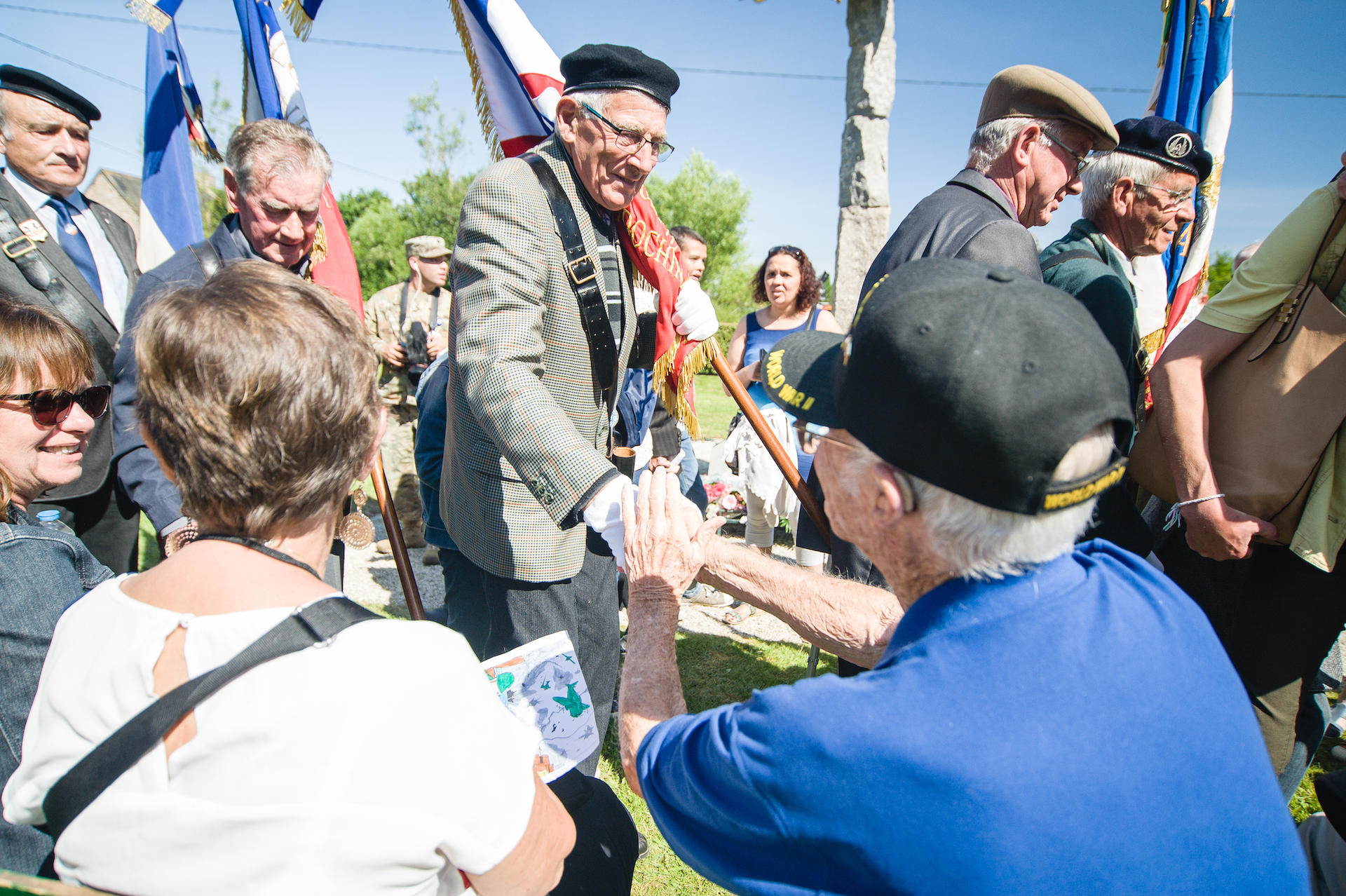 French ceremony participants greet World War II veterans during a memorial ceremony in Bricquebec-en-Contin, France, June 1, 2019. The annual ceremony is held to honor the lives of crewmen of the two B-17’s that were shot down near the towns of Bricquebec and Rocheville.