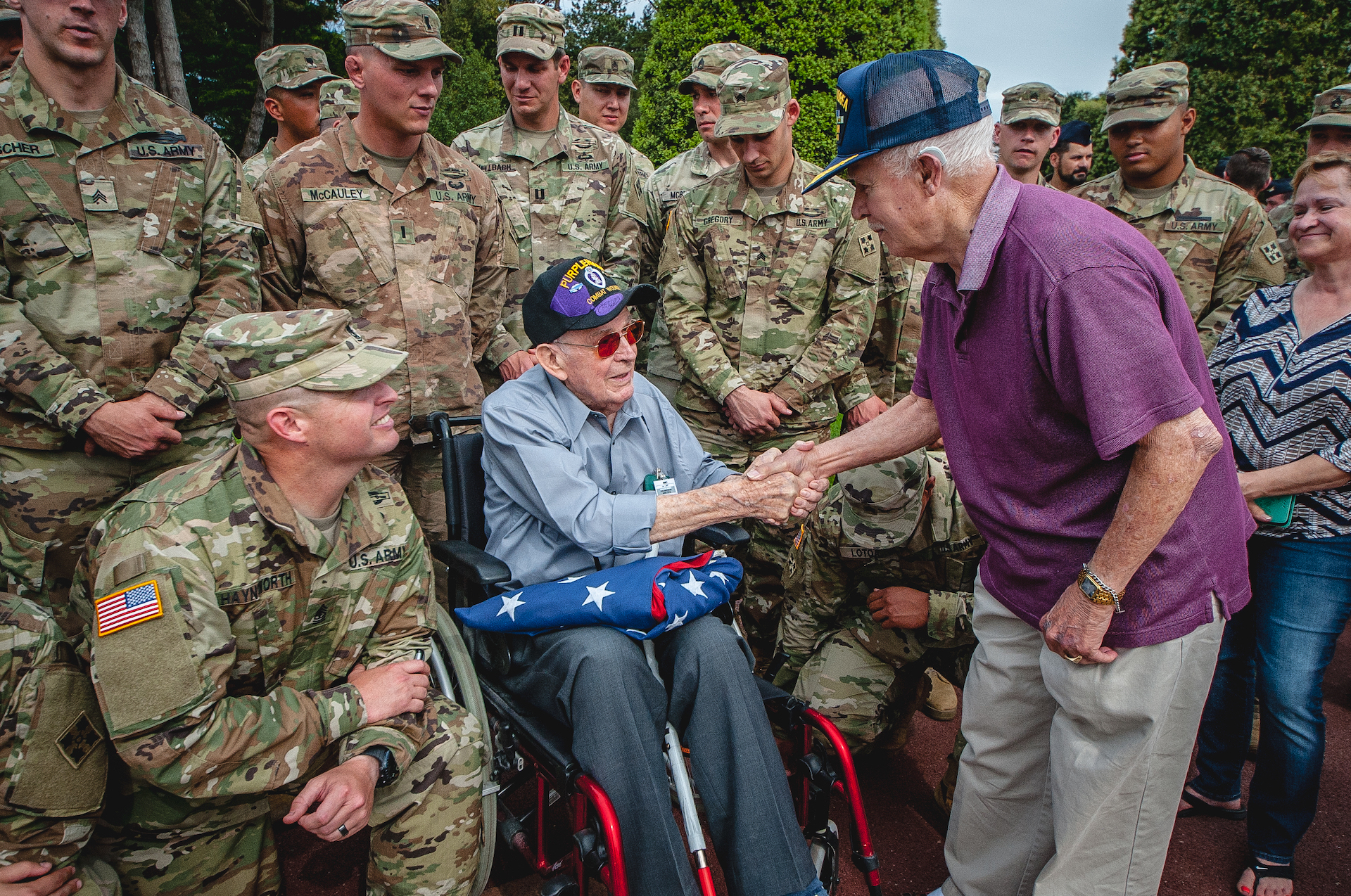 A World War II veteran shakes hands with a Korean War veteran during a memorial ceremony at the Normandy American Cemetery and Memorial in Colleville-sur-Mer, June 2, 2019. The cemetery site contains the graves of more than 9,380 U.S. service members - most of whom lost their lives in the D-Day landings and ensuing operations. This memorial ceremony is one of over eighty events happening during the 75th anniversary of D-Day in Normandy.