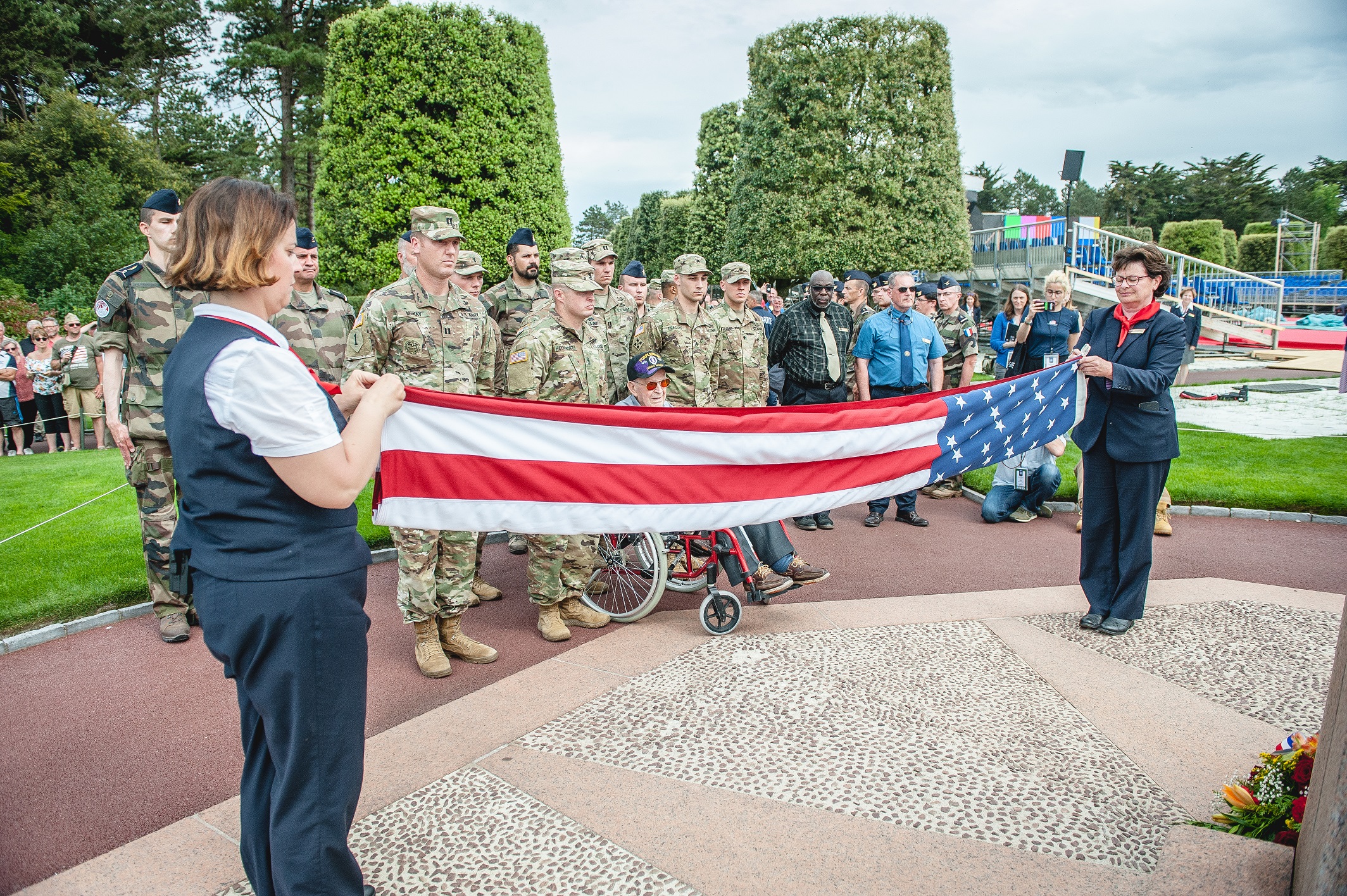 American Battle Monuments Commission staff members fold a U.S. flag during a memorial ceremony at the Normandy American Cemetery and Memorial in Colleville-sur-Mer, June 2, 2019.