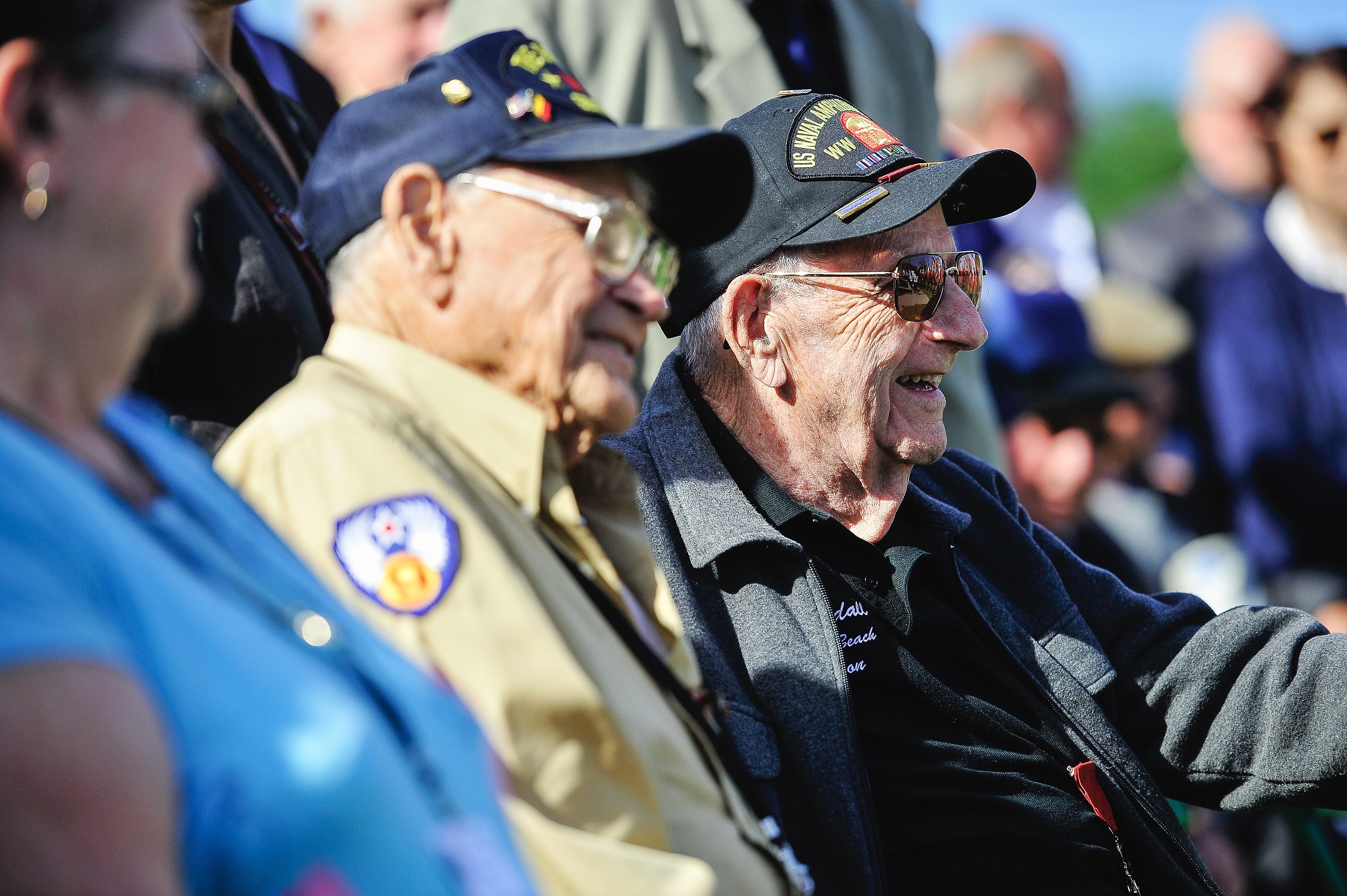 World War II veterans, Mr. John Carroll and Mr. Clifford Goodall, enjoy a laugh while participating in a memorial ceremony in Bricquebec-en-Contin, France, June 1, 2019. The annual ceremony is held to honor the lives of crewmen of the two B-17’s that were shot down near the towns of Bricquebec and Rocheville. Highlighting the strength of the U.S. commitment to European security, U.S. military personnel and equipment will support and commemorate the 75th anniversary of Operation Overlord, the Allied invasion of Normandy on June 6, 1944 - most commonly known as D-Day. The largest multi-national amphibious attack and operational military airdrop in history, D-Day is considered the beginning of the end of WWII in Europe.