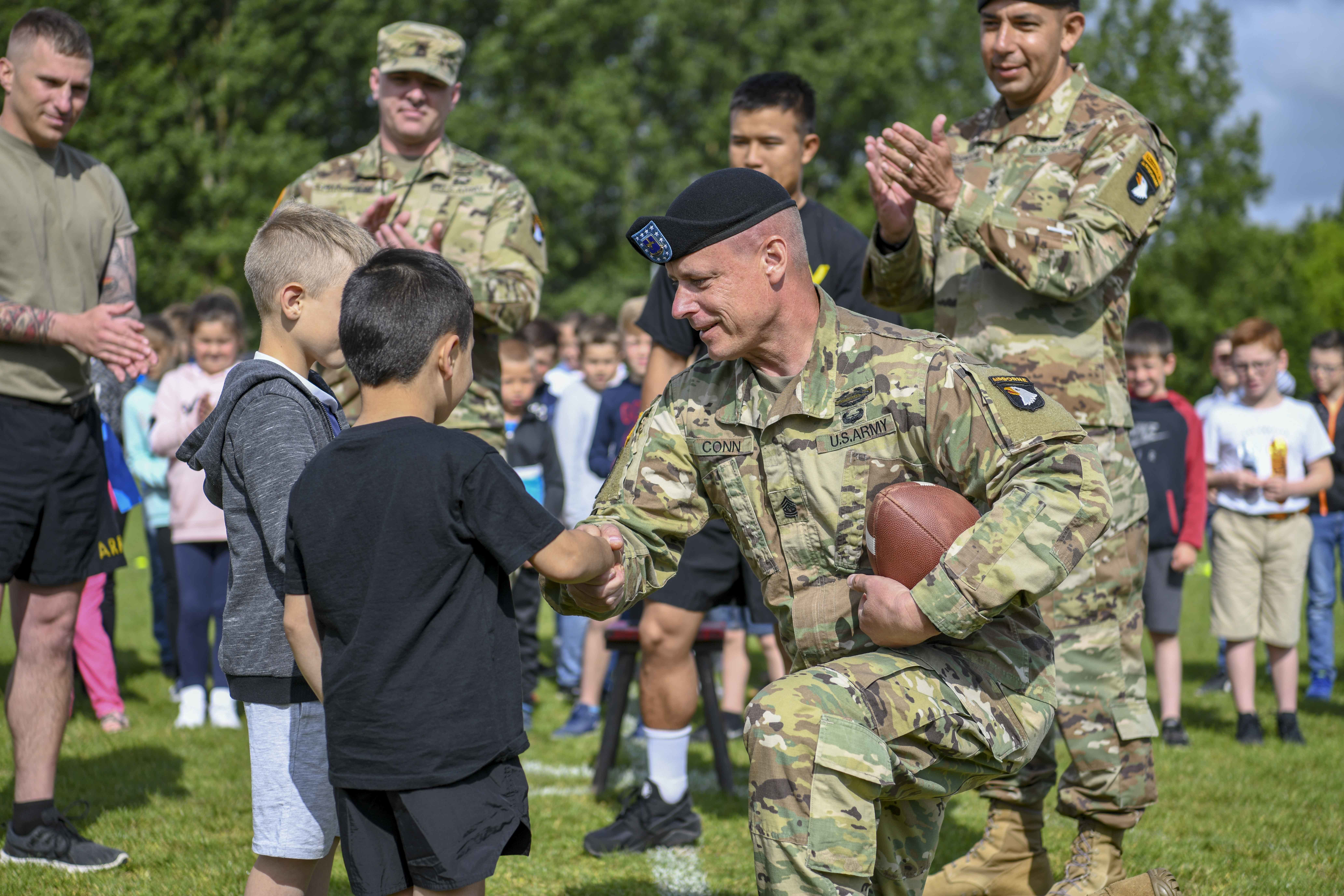 190603-N-TV337-1082 U.S. Army Command Sgt. Maj. Thomas Conn, senior enlisted leader, 2nd Brigade Combat Team, 101st Airborne Division (Air Assault), receives the game ball from Laris Bindian before the Remembrance Bowl 2019 in Carentan, France. More than 1,300 U.S. service members, partnered with 950 troops from across Europe and Canada, have converged in northwestern France to commemorate the 75th anniversary of Operation Overlord, the WWII Allied invasion of Normandy, commonly known as D-Day. Upwards of 80 ceremonies in 40 French communities in the region will take place between June 1-9, 2019, the apex being held June 6th at the American Cemetery at Coleville sur Mer. (U.S. Navy photo by Mass Communication Specialist 2nd Class Robert J. Baldock)