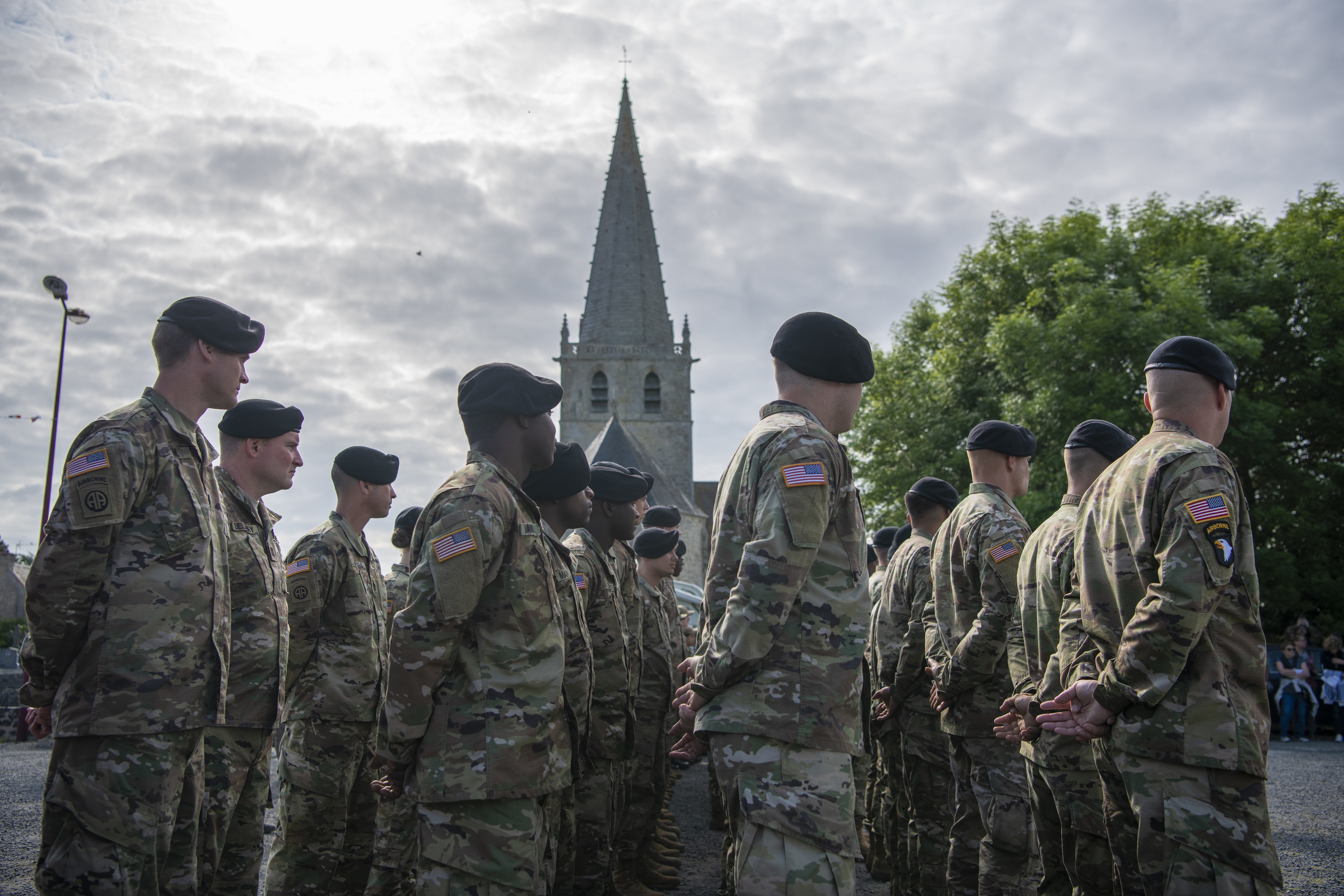 U.S. Army Soldiers from various units in formation in preparation for a historic 10k march throughout the D-Day battle sites of Picauville, France, on June 3, 2019 as part of commemorations honoring the 75th anniversary of Operation Overlord, the WWII Allied Invasion of Normandy, commonly known as D-Day.